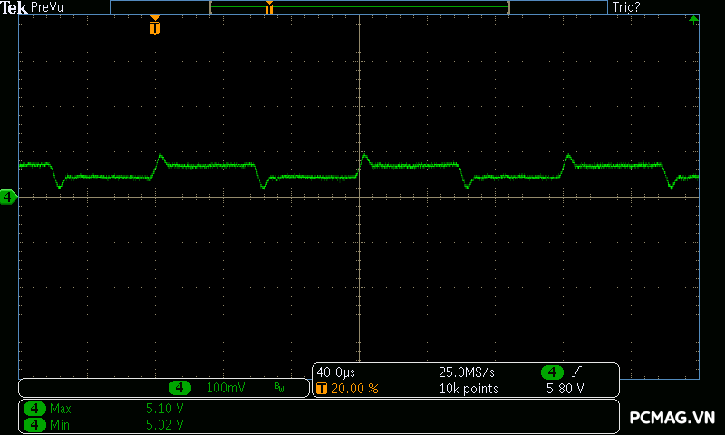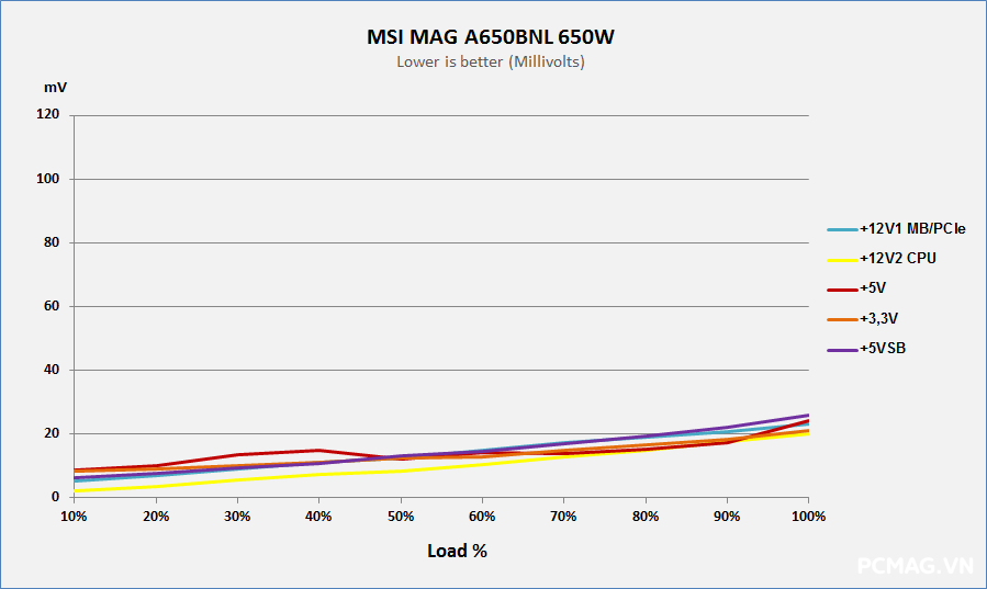 Trong quá trình đo kiểm, MSI MAG A650BNL cho thấy mức dao động điện áp trên các đường nguồn ở mức khá. Tuy nhiên, điểm đáng tiếc là đường 3.3V không duy trì được trong giới hạn tiêu chuẩn ATX, khi bị lệch ra ngoài ngưỡng cho phép ở tất cả các mức thử nghiệm.