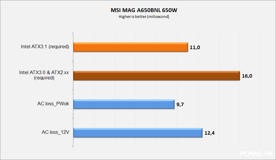 Kết quả đo cho thấy MSI MAG A650BNL đạt thời gian lưu điện khoảng 9,7ms, trong khi đường 12V bắt đầu rơi ra ngoài giới hạn sau khoảng 12,4ms. Với thông số này, bộ nguồn chưa đáp ứng được yêu cầu tối thiểu 16ms theo tiêu chuẩn ATX, thể hiện một điểm hạn chế về khả năng duy trì điện áp khi mất nguồn đột ngột.