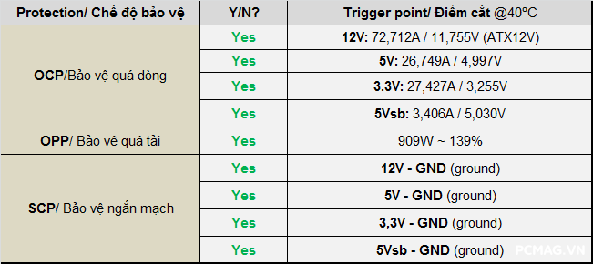 Trong quá trình kiểm tra, MSI MAG A650BNL cho thấy các cơ chế bảo vệ OCP, OPP và SCP hoạt động ổn định và chính xác. Bộ nguồn tự động ngắt khi chạm ngưỡng bảo vệ, đồng thời hoạt động trở lại bình thường sau khi khởi động lại, không ghi nhận bất kỳ sự cố hay hiện tượng bất thường nào.
