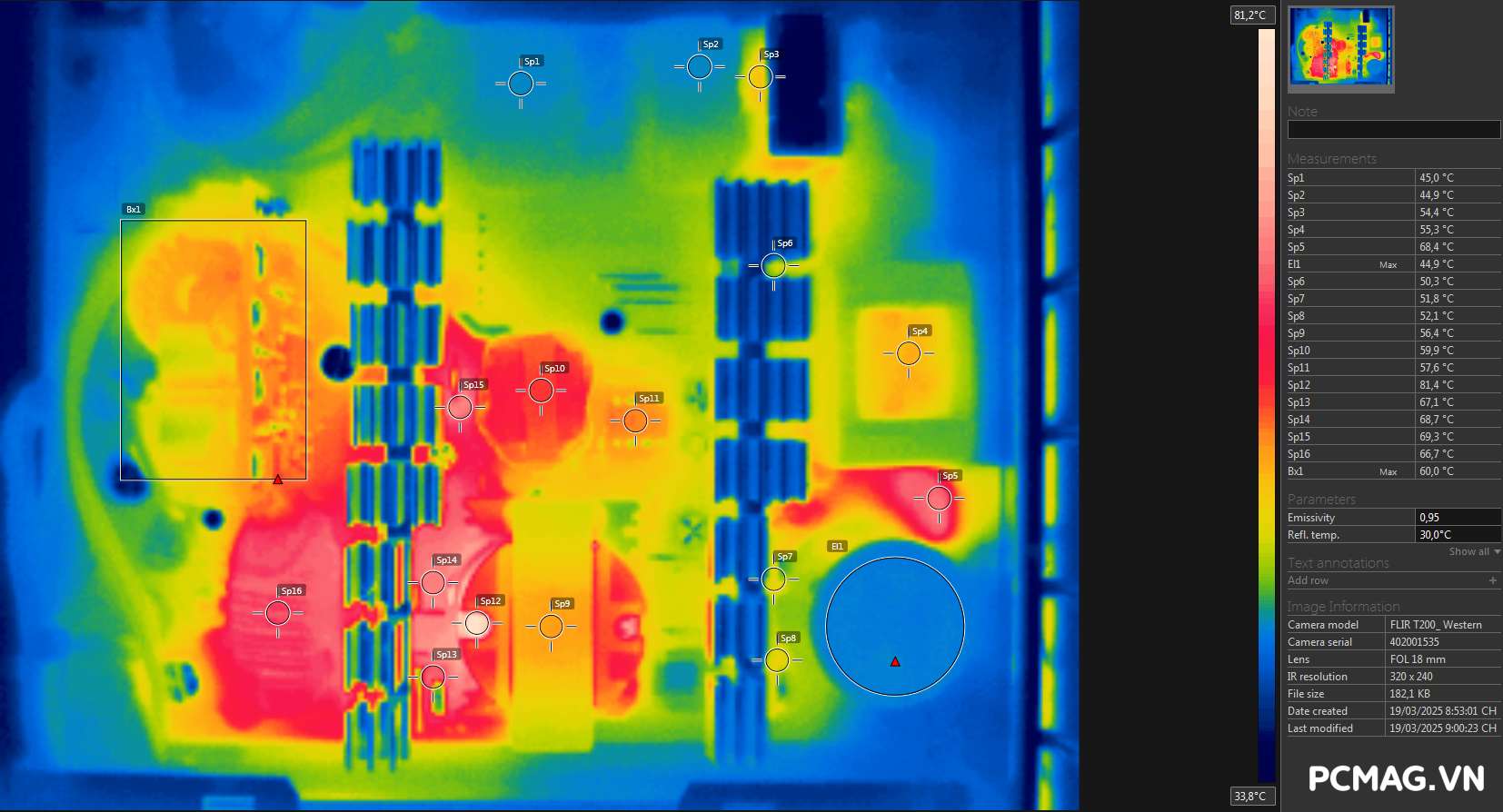 Bài thử nghiệm được tiến hành trong điều kiện môi trường từ 38–45°C, mô phỏng kịch bản vận hành khắc nghiệt. Trên MSI MAG A650BNL, khu vực có nhiệt độ cao nhất nằm tại ngõ ra của biến áp chính, theo sau là linh kiện hạn dòng khởi động NTC, với mức nhiệt ghi nhận xấp xỉ quanh 80°C.