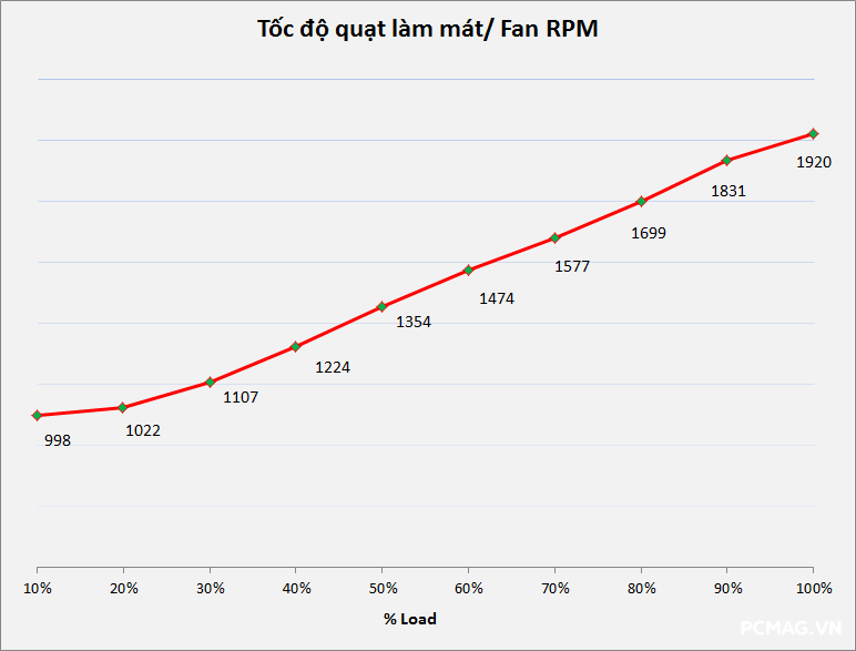 Về quạt làm mát, đặc tính hoạt động khá đơn giản: tốc độ tăng dần theo mức tải, tương ứng với lượng nhiệt phát sinh, và đạt tối đa khoảng 2000 RPM. Mức vòng tua này đủ đảm bảo khả năng tản nhiệt cho các linh kiện công suất bên trong, tuy nhiên đổi lại là độ ồn tăng lên, khó có thể đánh giá cao về sự êm ái khi tải nặng.