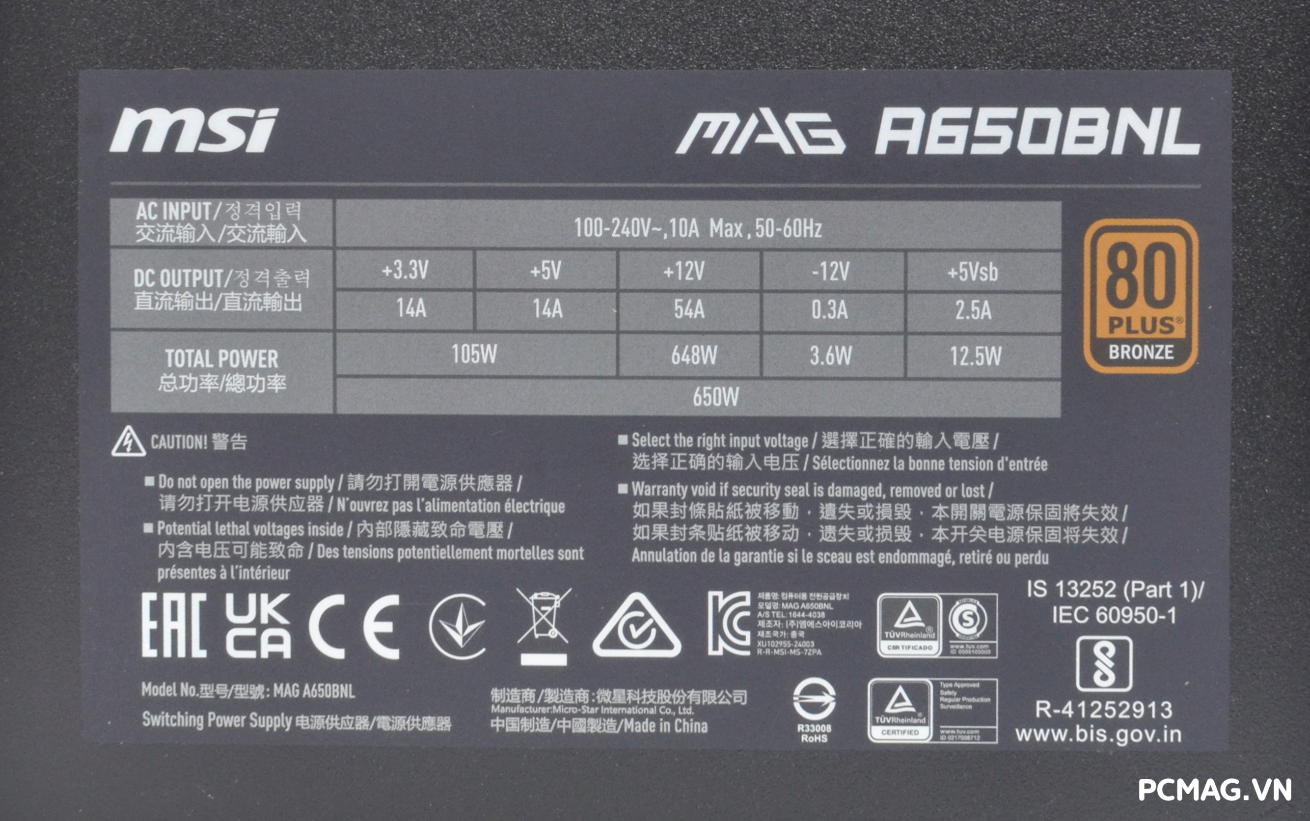 MAG A650BNL có công suất danh định 650W, sử dụng đường 12V single rail với công suất tối đa lên tới 648W, đảm bảo khả năng cấp điện ổn định cho toàn hệ thống. Bộ nguồn hỗ trợ Active PFC full-range và đạt chứng nhận hiệu suất 80Plus Bronze, đáp ứng tốt nhu cầu sử dụng trong các cấu hình PC tầm trung hiện nay.
