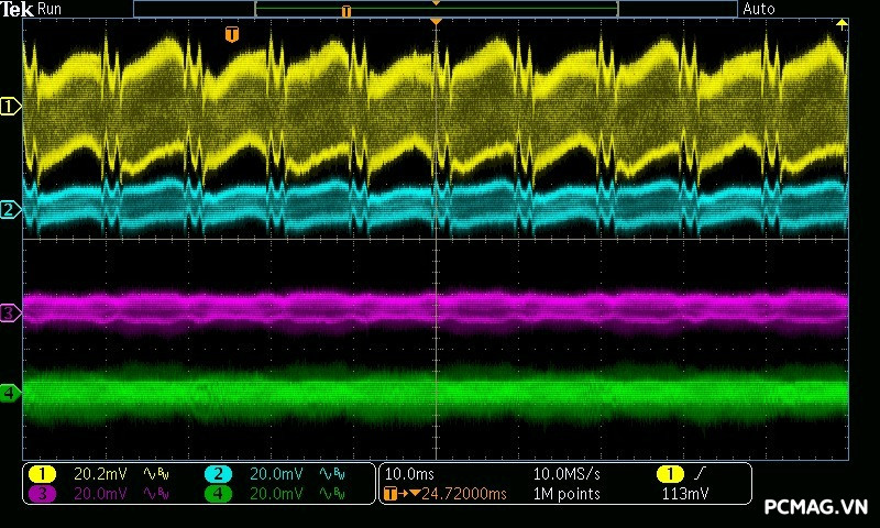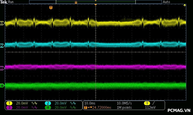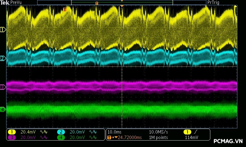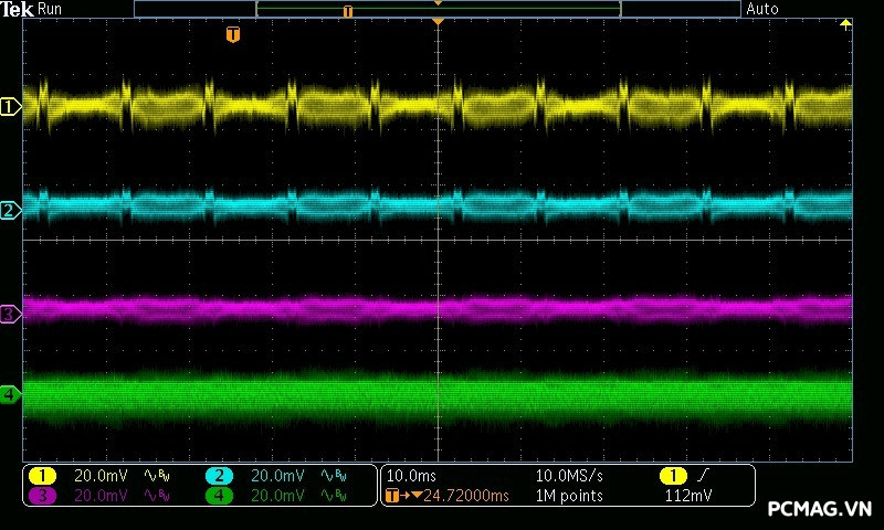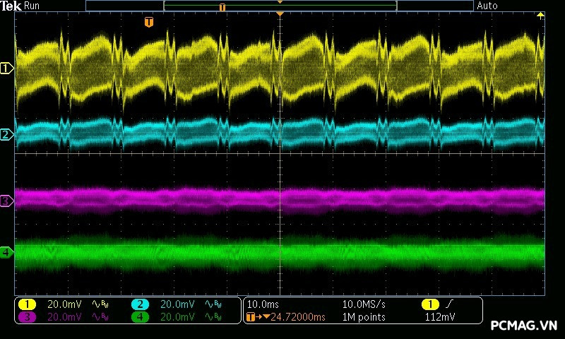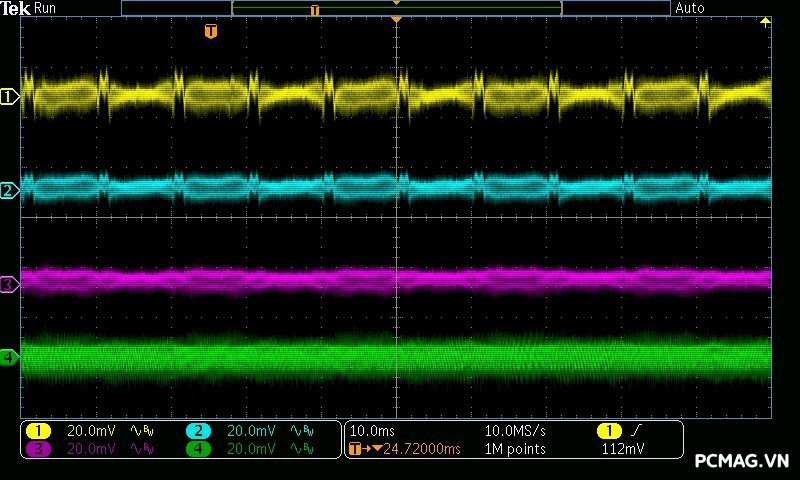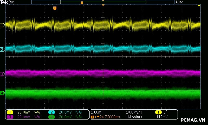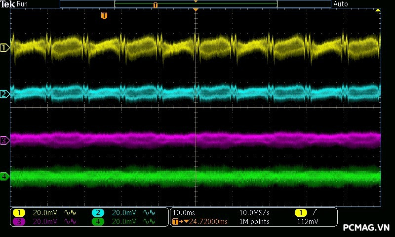Beta P700 700W ghi nhận mức ripple noise ở mức tương đối ổn. Đường 12V đạt khoảng 80mV tại tải tối đa, trong khi các đường điện còn lại giữ mức dao động quanh ±20mV, vẫn nằm trong giới hạn chấp nhận được của chuẩn ATX.