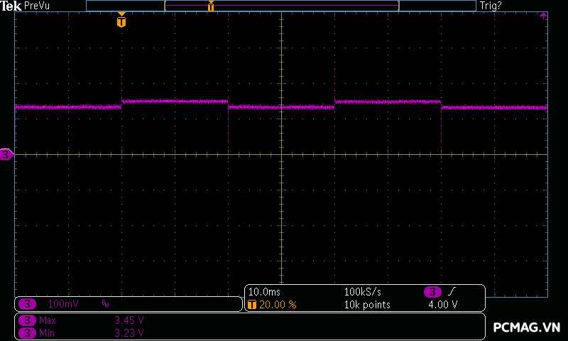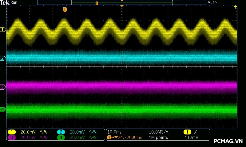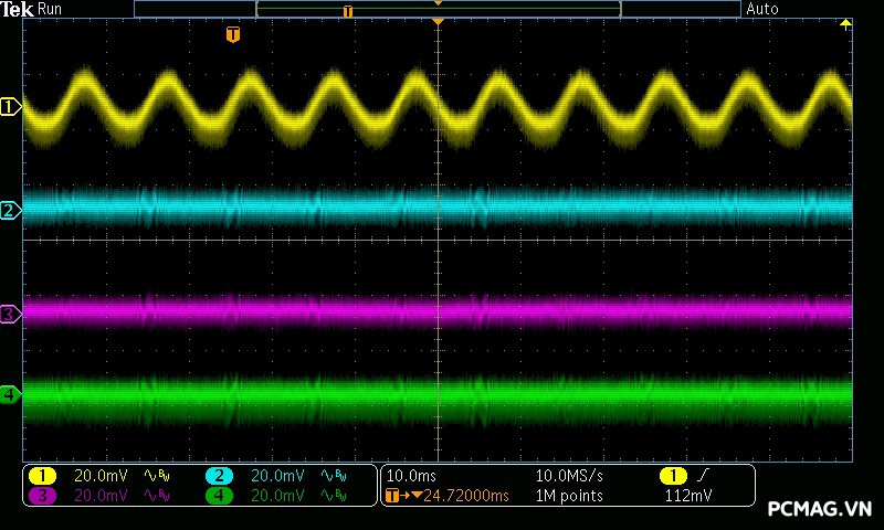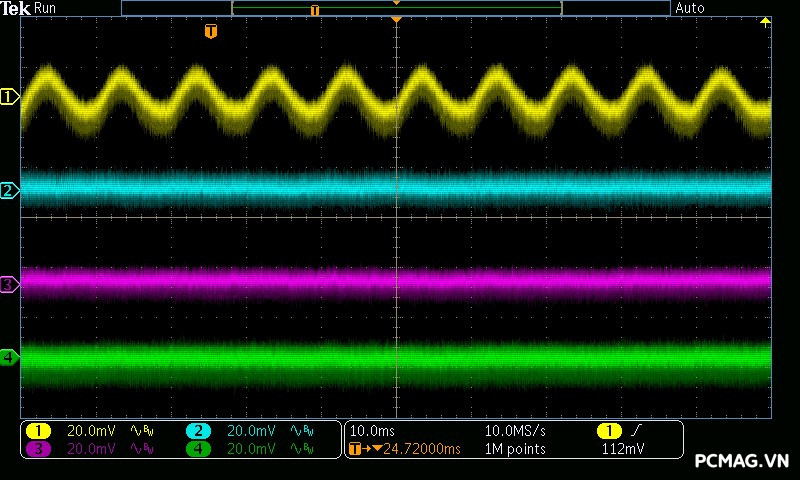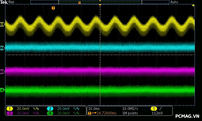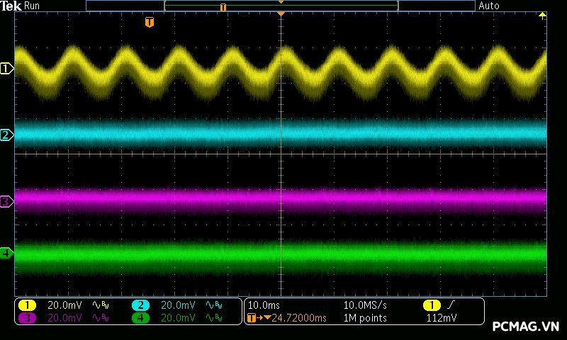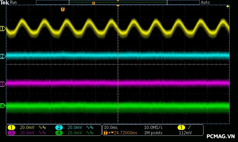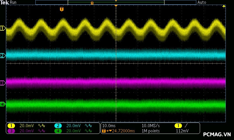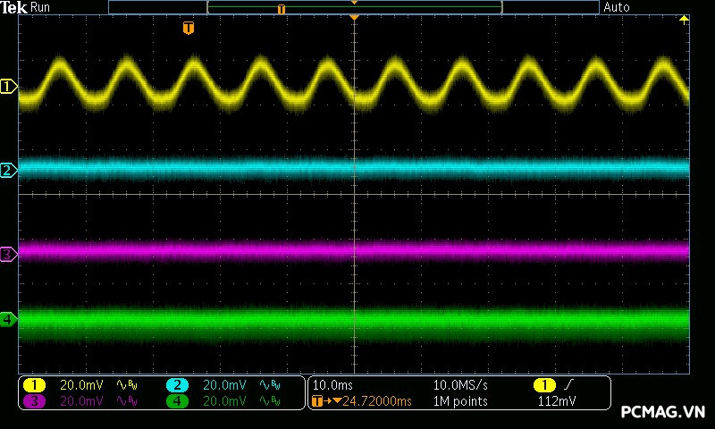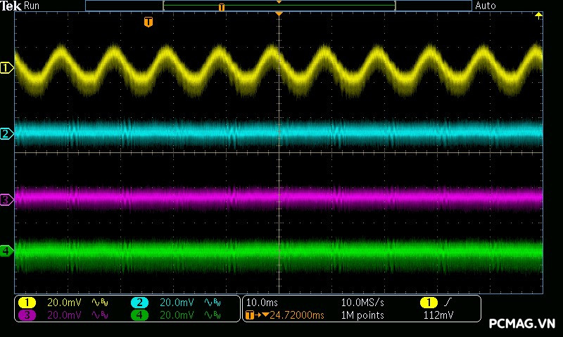 Mức nhiễu cao tần trên AMP GH 1200W ATX3.1/PCIe 5.1 được kiểm soát rất tốt: đường 12V chỉ dao động khoảng ±25 mV, trong khi các đường điện còn lại duy trì mức nhiễu thấp hơn, khoảng ±17 mV. Đây đều là những giá trị đẹp, đảm bảo độ ổn định và sạch điện cho hệ thống.