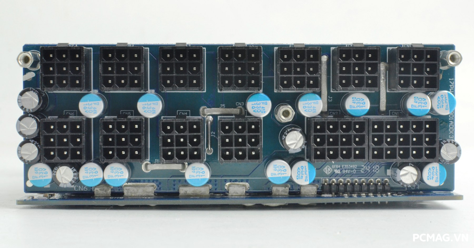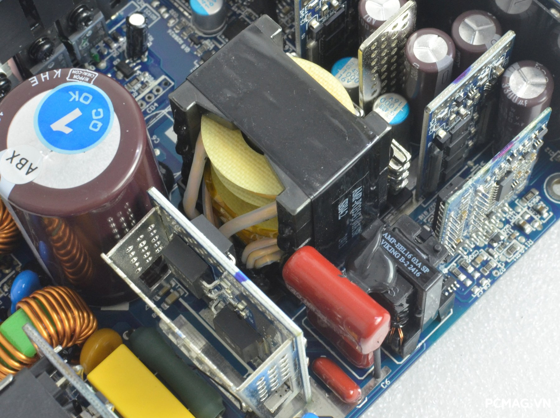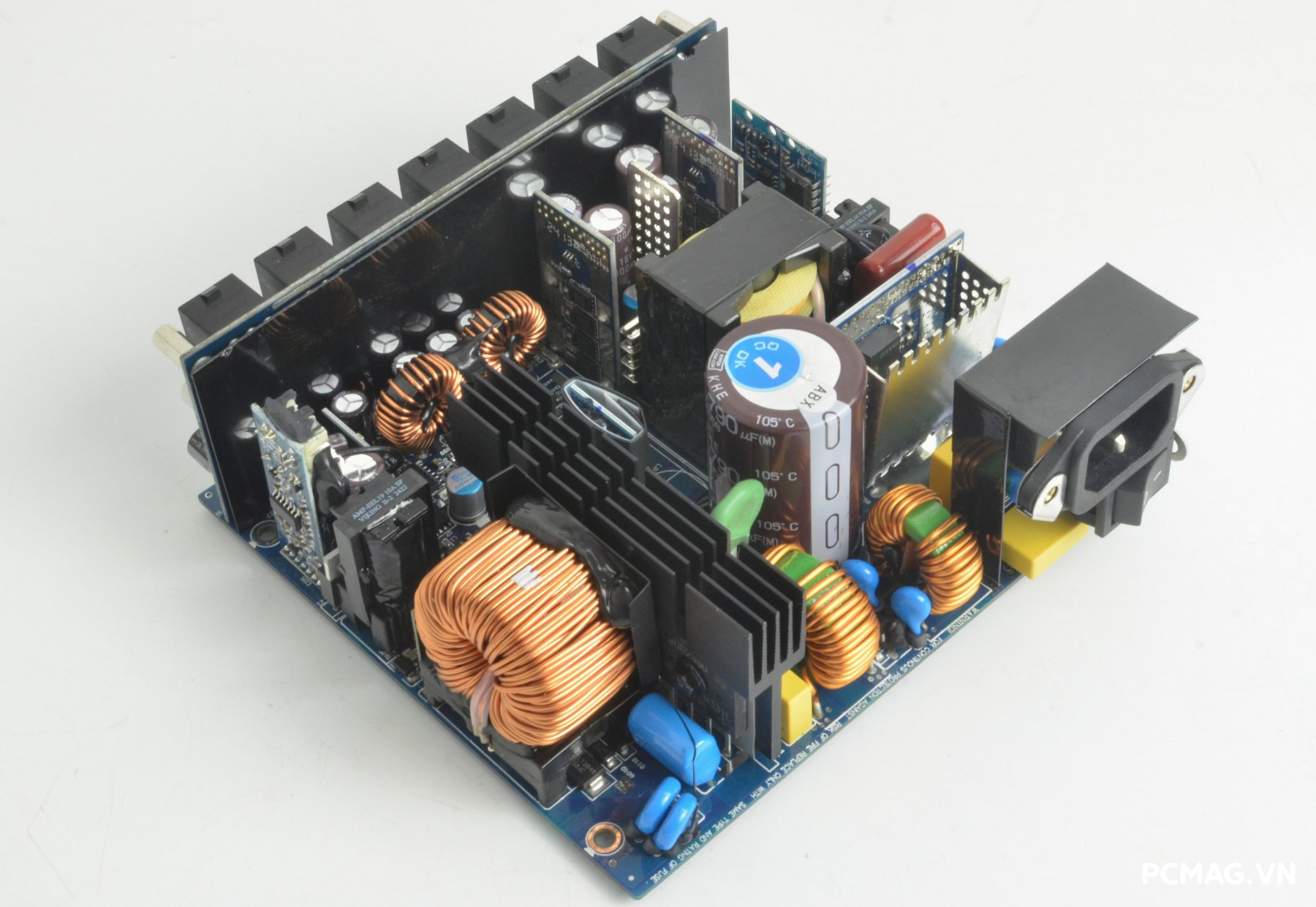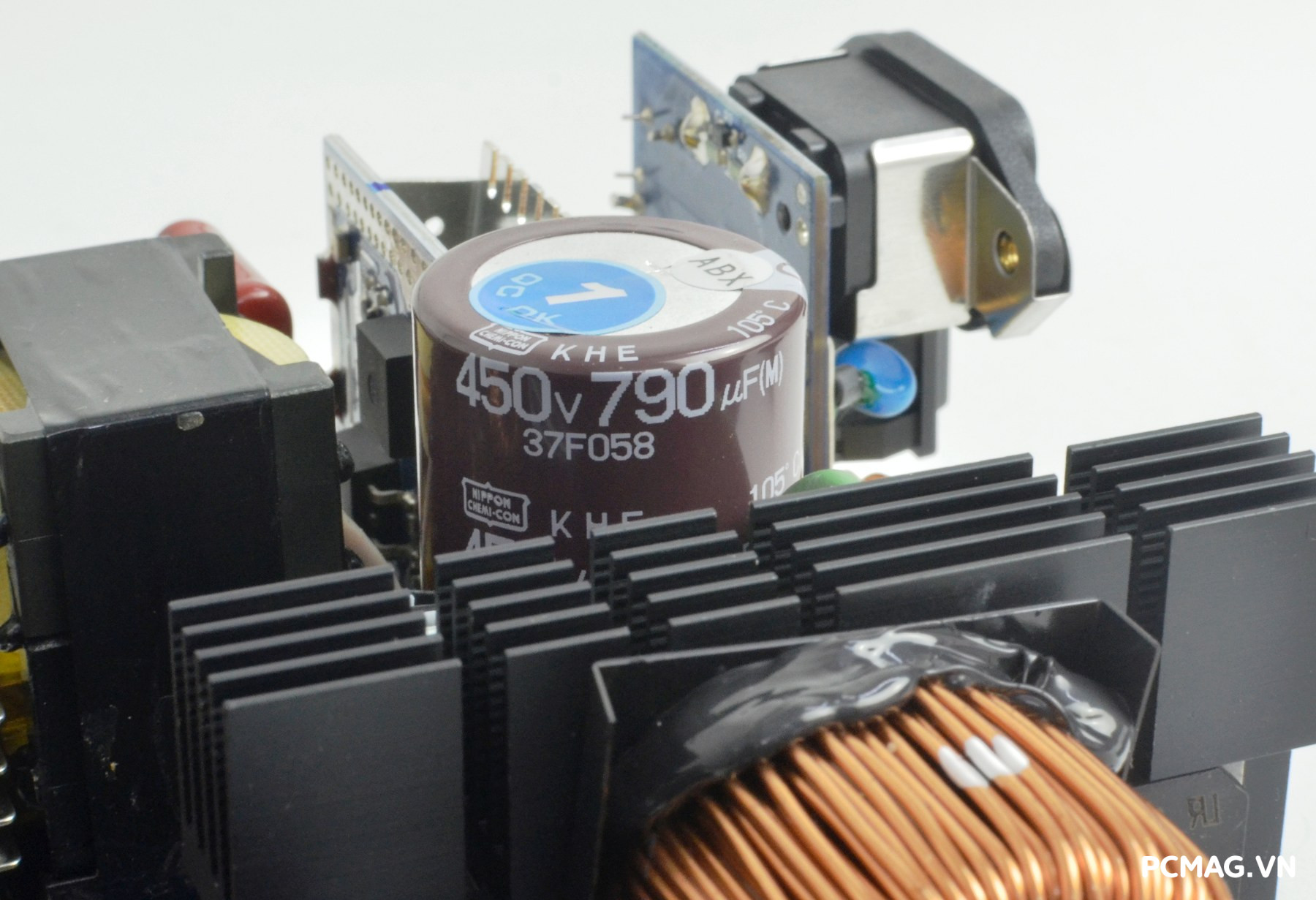 Các tụ điện lọc nhiễu đầu ra đều đến từ những thương hiệu Nhật Bản hàng đầu như Nippon / NPCAP và Rubycon, đảm bảo độ ổn định điện áp cũng như tuổi thọ lâu dài cho bộ nguồn. Bo mạch in (PCB) của Leadex VII Platinum Pro 1200W được hoàn thiện ở mức tốt và gọn gàng, bố cục linh kiện hợp lý. Tuy nhiên, vẫn còn một vài vết flux thừa chưa được làm sạch hoàn toàn, đây là chi tiết nhỏ nhưng có thể được cải thiện hơn nữa để đạt độ hoàn thiện cao nhất.