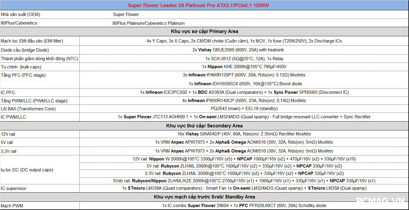 Bảng linh kiện được sử dụng trên Leadex VII Platinum PRO 1200W :