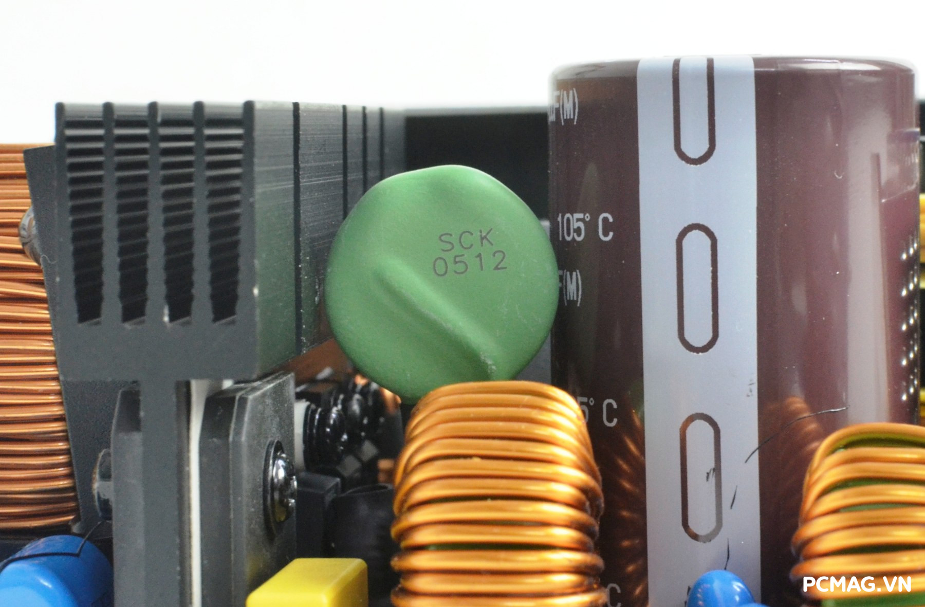 Bộ nguồn sử dụng cặp diode cầu GBU2560 công suất 25A (×2), được gắn trực tiếp lên phiến tản nhiệt của MOSFET tầng PFC, qua đó cải thiện khả năng thoát nhiệt và đảm bảo độ ổn định khi hoạt động ở tải cao. Ở phần tụ chính, Super Flower trang bị tụ Nippon Chemi-Con (Nhật Bản) với thông số 790µF / 450V, khẳng định chất lượng linh kiện cao cấp và độ bền lâu dài trong quá trình sử dụng.