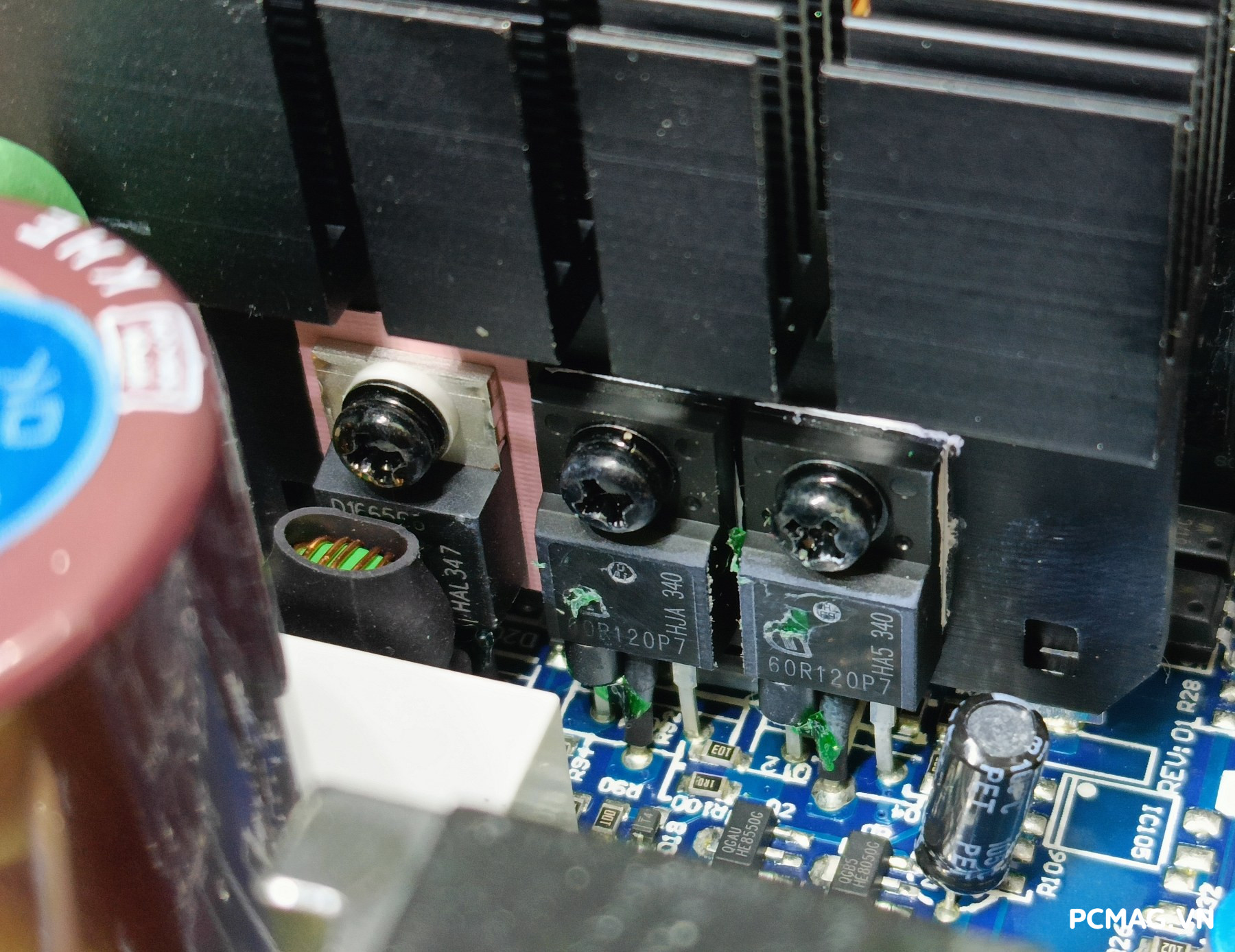 Tầng PFC được trang bị 3 MOSFET IPA60R120P7 với dòng chịu tải 26A, đến từ Infineon (Đức), đảm bảo hiệu suất và độ ổn định cao. Phần điều khiển sử dụng IC tạo dao động ICE3PCS02 – cũng do Infineon sản xuất – kết hợp với IC disconnect SPN5003, giúp giảm hao phí điện năng ở chế độ chờ. Bên cạnh đó, hệ thống còn tích hợp IC so sánh điện áp AS393A, góp phần duy trì điện áp đầu ra ổn định và chính xác trong nhiều mức tải khác nhau.