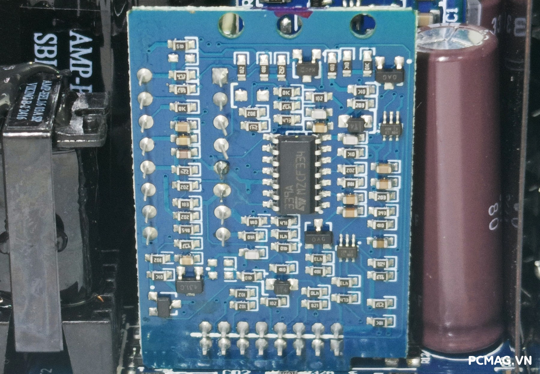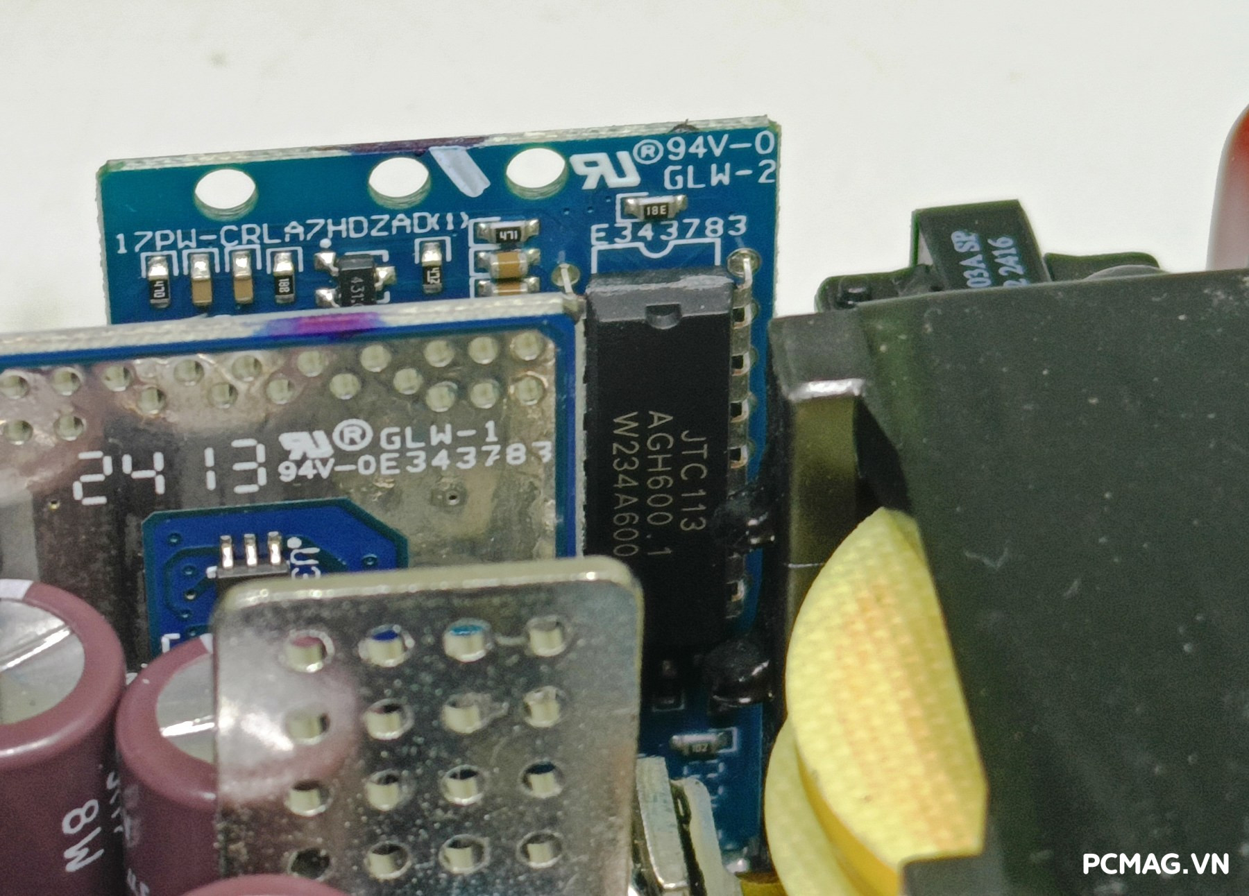 Tầng lọc nhiễu EMI được bố trí hoàn toàn trên bo mạch chính, với cấu hình đầy đủ hai lớp lọc tiêu chuẩn, đi kèm linh kiện chống sét MOV nhằm bảo vệ bộ nguồn trước các hiện tượng xung điện bất thường. Ngoài ra, tại các điểm tiếp địa của tụ Y còn được trang bị lõi ferrite, giúp tăng cường khả năng triệt tiêu nhiễu cao tần và hạn chế tối đa các xung nhiễu phát sinh trong quá trình vận hành.