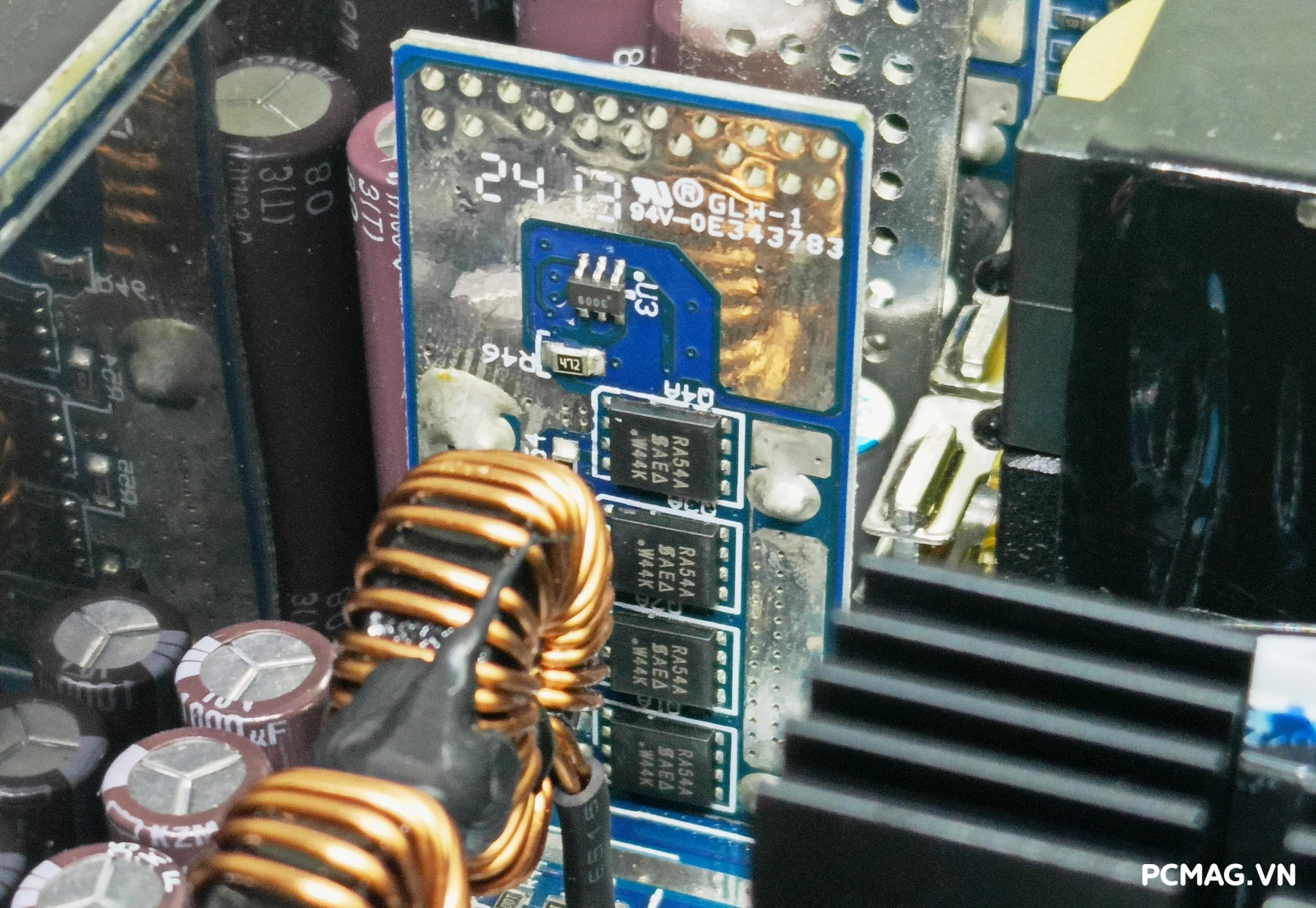 Mạch VRMs (DC-to-DC) cho các đường 5V và 3.3V được thiết kế thành hai khối mạch riêng biệt nhưng có cấu trúc tương đồng. Mỗi khối sử dụng IC dao động Anpec APW7073 để điều khiển 2 MOSFET AON6516, đảm bảo khả năng chuyển đổi điện áp ổn định và hiệu quả. Toàn bộ các linh kiện của mạch VRMs đều được hàn ở mặt trên của bo mạch chính, giúp tối ưu bố cục linh kiện cũng như khả năng tản nhiệt.