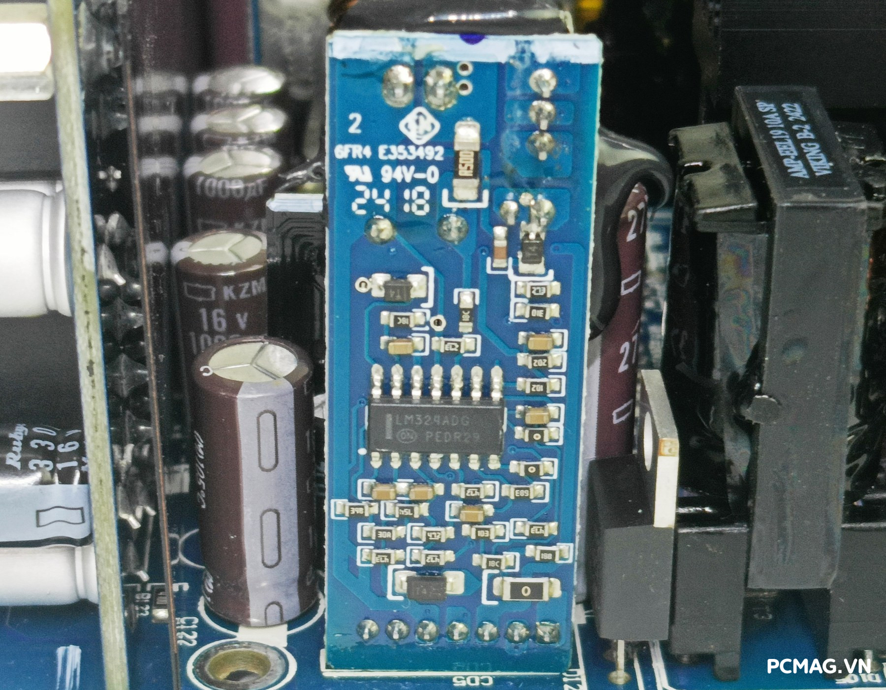 Hệ thống IC giám sát sử dụng LM339A đảm nhiệm vai trò so sánh và theo dõi điện áp, giúp bộ nguồn vận hành an toàn và ổn định. Mạch Smart Fan với tính năng Semi-Fanless được điều khiển bởi hai op-amp LM324 và LM358, cho phép quạt hoạt động linh hoạt theo mức tải và nhiệt độ. Bên cạnh đó, mạch cấp trước 5VSB được xây dựng từ IC combo 29604 do chính Super Flower cung cấp, đảm bảo nguồn điện chờ ổn định cho hệ thống.