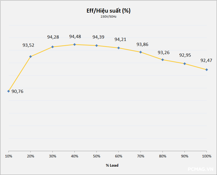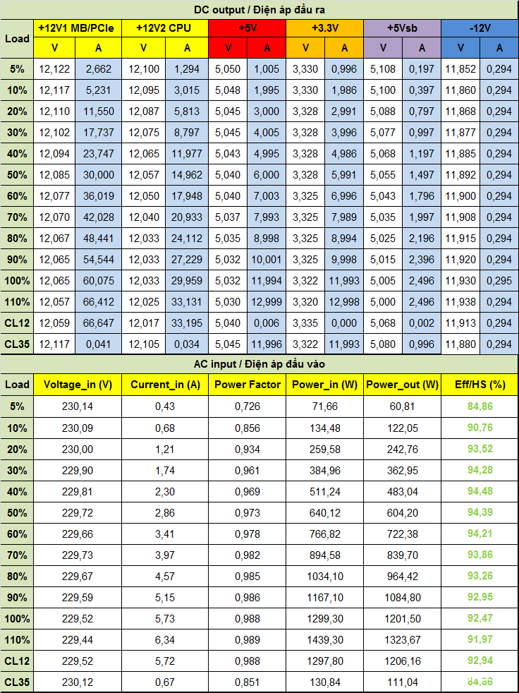Kết quả đo đạc cho thấy Leadex VII Platinum Pro 1200W thể hiện chất lượng điện áp rất tốt, với biên độ dao động nhỏ và luôn nằm gọn trong giới hạn tiêu chuẩn ATX 3.0. Nhờ sử dụng thiết kế DC-to-DC, bộ nguồn không xuất hiện bất kỳ hiện tượng bất thường nào, kể cả khi vận hành ở các mức tải không đồng đều (Cross Load). Về hiệu suất, sản phẩm đạt mức tối đa 94.48% tại 230Vac, hoàn toàn tương xứng với các chứng nhận 80Plus Platinum và Cybenetics Platinum.