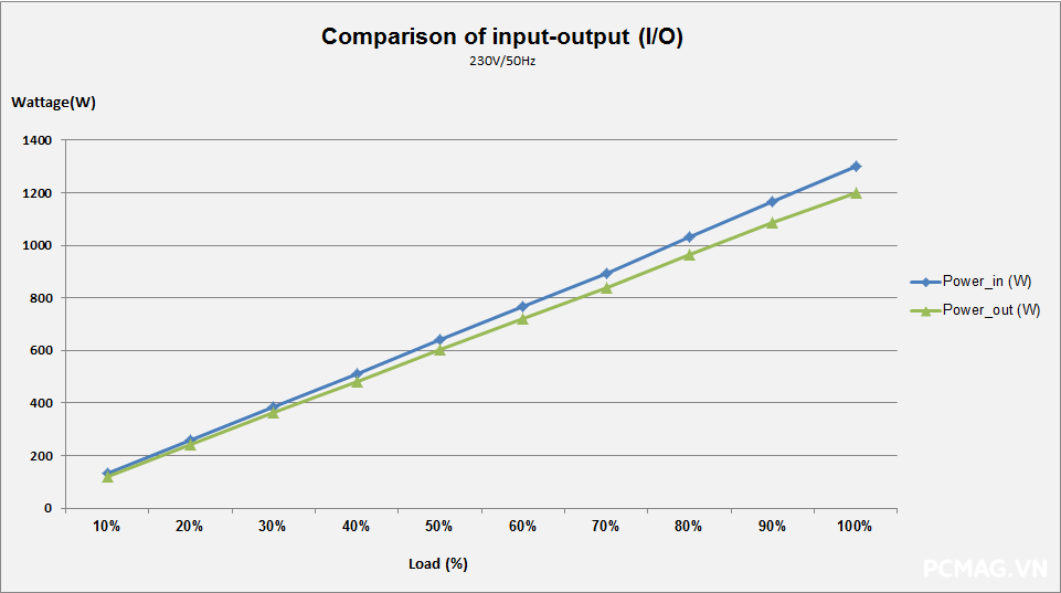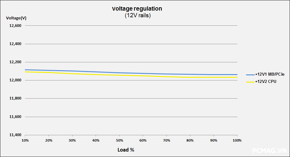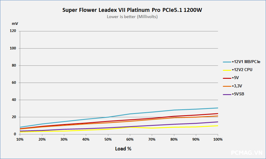 Kết quả thử nghiệm chi tiết được trình bày ở phần bên dưới cho thấy Leadex VII Platinum Pro 1200W kiểm soát điện áp rất tốt, với mức dao động trên tất cả các đường điện đều nằm trong giới hạn tiêu chuẩn ATX.