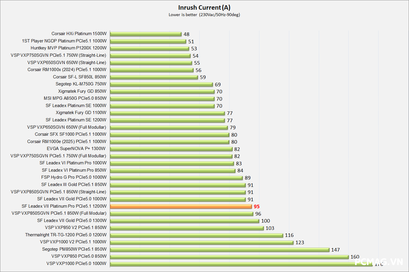Trong bài kiểm tra dòng khởi động (Inrush Current), Leadex VII Platinum Pro 1200W ghi nhận mức dòng khởi động trung bình vào khoảng 95A, phù hợp với đặc thù của các bộ nguồn công suất lớn và nằm trong ngưỡng kiểm soát an toàn khi cấp điện ban đầu.