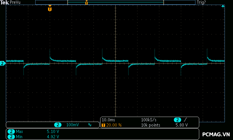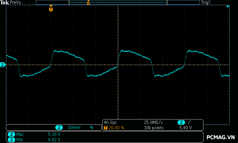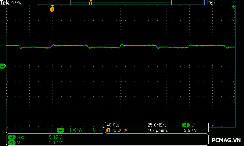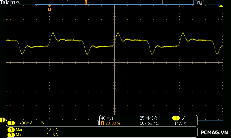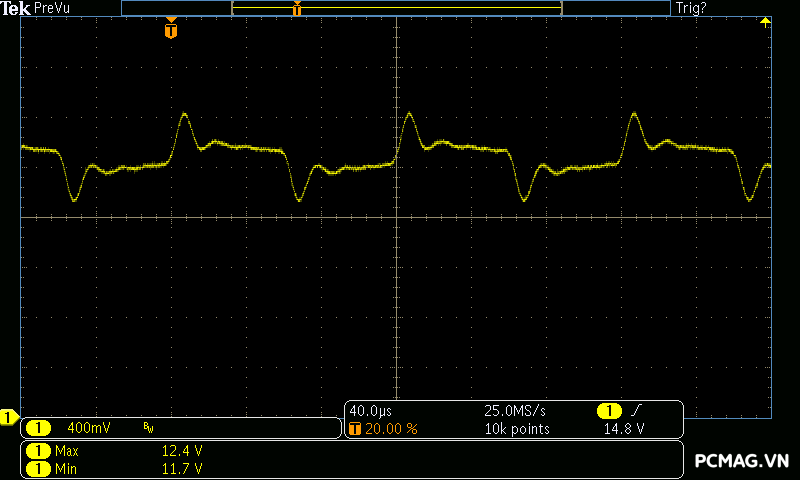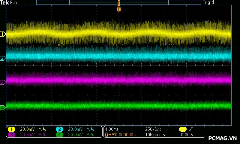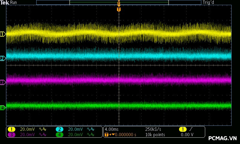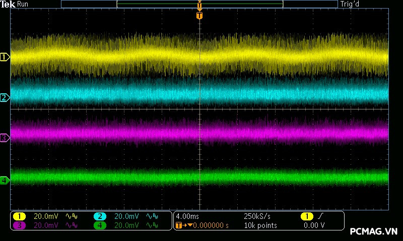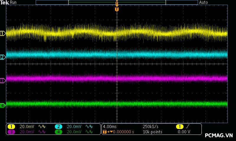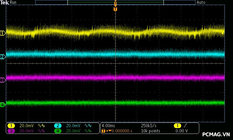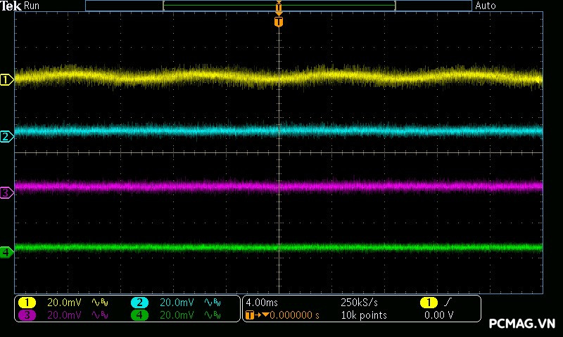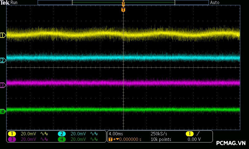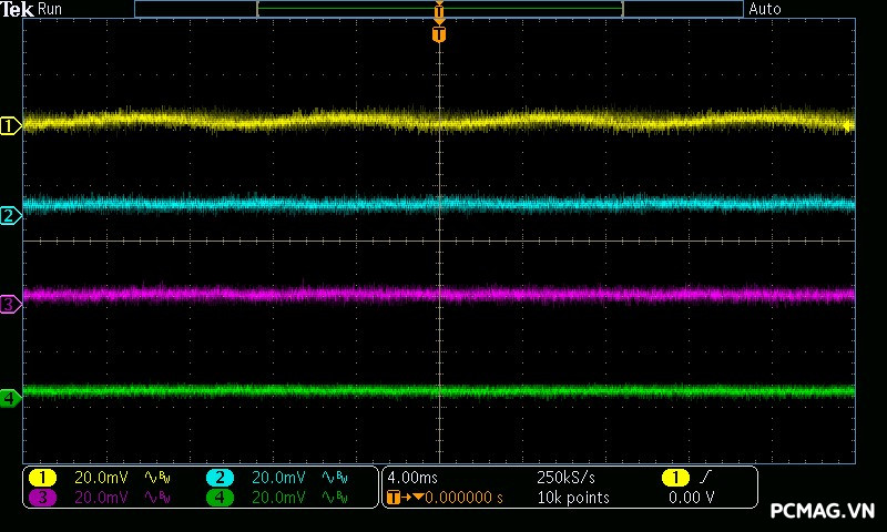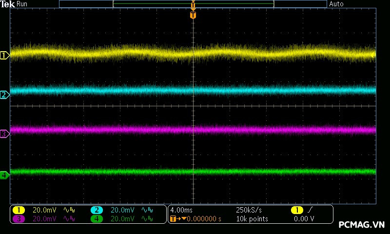 Cụ thể, đường 12V1 (MB/PCIe) ghi nhận mức ripple cao hơn, nhưng vẫn được kiểm soát rất tốt với giá trị tối đa dưới 30mV, trong khi đường 12V2 (CPU) lại cho kết quả cực kỳ ấn tượng, với mức nhiễu chỉ vào khoảng 10mV. Những con số này đều nằm sâu trong giới hạn cho phép của chuẩn ATX, cho thấy chất lượng lọc và thiết kế mạch nguồn ở mức rất cao.