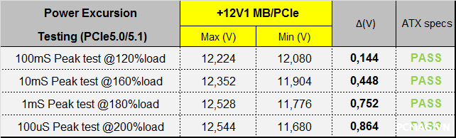 Đặc biệt, trong bài test mô phỏng dòng tiêu thụ tức thời của GPU (Power Excursion), bộ nguồn dễ dàng vượt qua mà không xuất hiện bất kỳ hiện tượng mất ổn định hay “sập nguồn” nào, khẳng định khả năng đáp ứng tải đột biến xuất sắc khi sử dụng với các card đồ họa hiệu năng cao thế hệ mới.