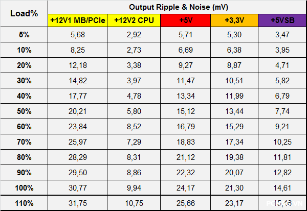 Kể từ ngày 14/04/2023, đường -12V đã được bổ sung vào danh mục thử tải, đồng thời xuất hiện thêm mức thử ở 5% Load, giúp đánh giá chính xác hơn hiệu năng của bộ nguồn trong điều kiện tải thấp.