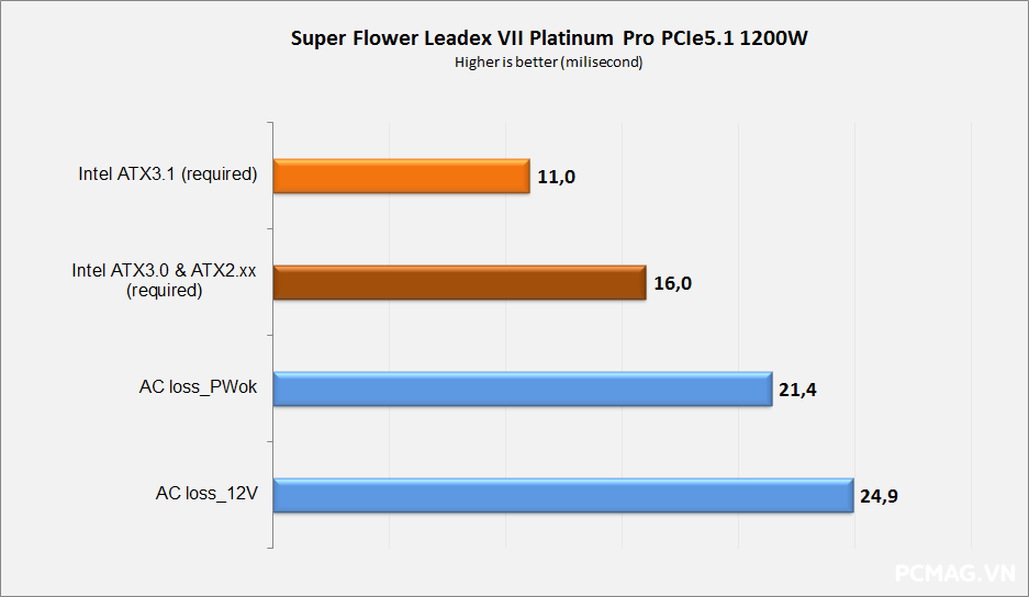 Trong bài kiểm tra thời gian lưu điện, Leadex VII Platinum Pro 1200W cho kết quả vượt yêu cầu của tiêu chuẩn ATX. Cụ thể, tín hiệu PG_OK duy trì ở mức 21.4 ms / 11 ms, trong khi đường 12V chỉ rời khỏi ngưỡng điện áp an toàn sau 24.9 ms. Kết quả này cho thấy khả năng duy trì nguồn ổn định khi mất điện ngắn hạn, góp phần bảo vệ hệ thống và hạn chế rủi ro trong quá trình vận hành.