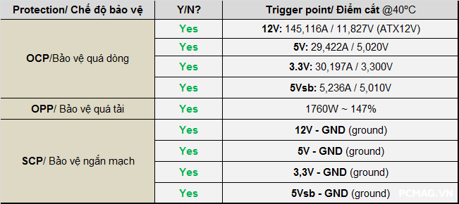 Các cơ chế bảo vệ trên Leadex VII Platinum Pro 1200W hoạt động ổn định và chính xác, với ngưỡng cắt dòng được thiết lập hợp lý theo đúng tiêu chuẩn an toàn. Trong quá trình thử nghiệm, bộ nguồn phản ứng đúng như kỳ vọng ở mọi tình huống giả lập, không ghi nhận bất kỳ vấn đề hay điểm trừ nào, cho thấy hệ thống bảo vệ được hoàn thiện tốt và đáng tin cậy.