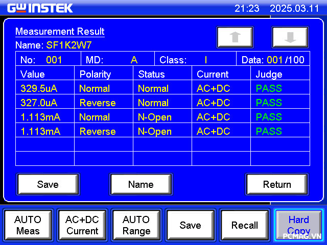 Để đánh giá chính xác thông số này, quá trình đo dòng rò được thực hiện bằng thiết bị chuyên dụng GW Instek GLC-9000, đảm bảo kết quả kiểm tra đáp ứng các yêu cầu an toàn điện đối với bộ nguồn máy tính.