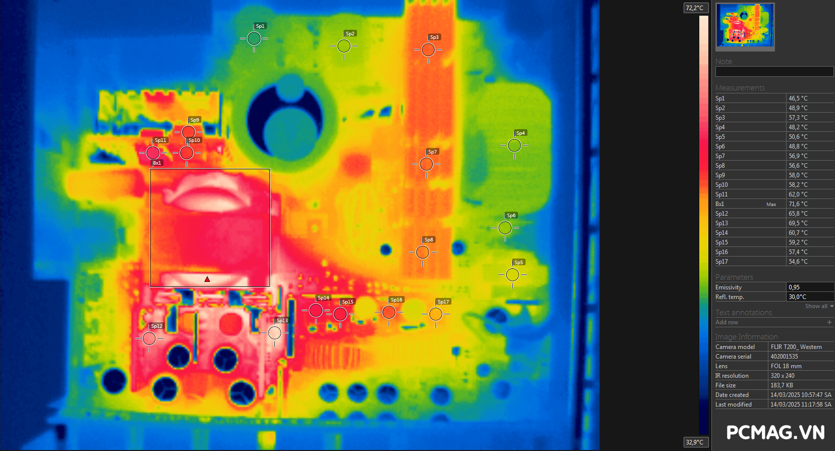 Nhờ hiệu suất cao, lượng nhiệt sinh ra được kiểm soát tốt. Kết quả đo cho thấy khu vực nóng nhất của PSU nằm tại ngõ ra biến áp chính và vùng đầu vào của các MOSFET chỉnh lưu đồng bộ, với nhiệt độ ghi nhận chỉ vào khoảng 72°C, cho thấy khả năng tản nhiệt và quản lý nhiệt rất hiệu quả.