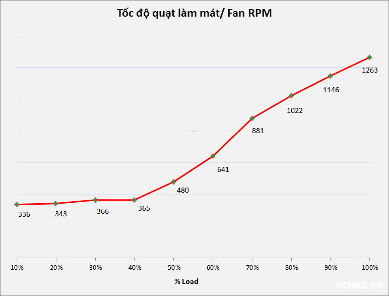 Ở mức tải thấp, quạt quay với tốc độ rất thấp, chỉ khoảng trên 300 RPM, gần như không gây tiếng ồn. Khi tải tăng và PSU bắt đầu nóng lên (trên ~60% load), quạt mới dần tăng tốc và đạt mức tối đa khoảng 1300 RPM ở tải cao. Cách điều khiển này giúp bộ nguồn vận hành êm ái và ổn định trong hầu hết các tình huống sử dụng thực tế.