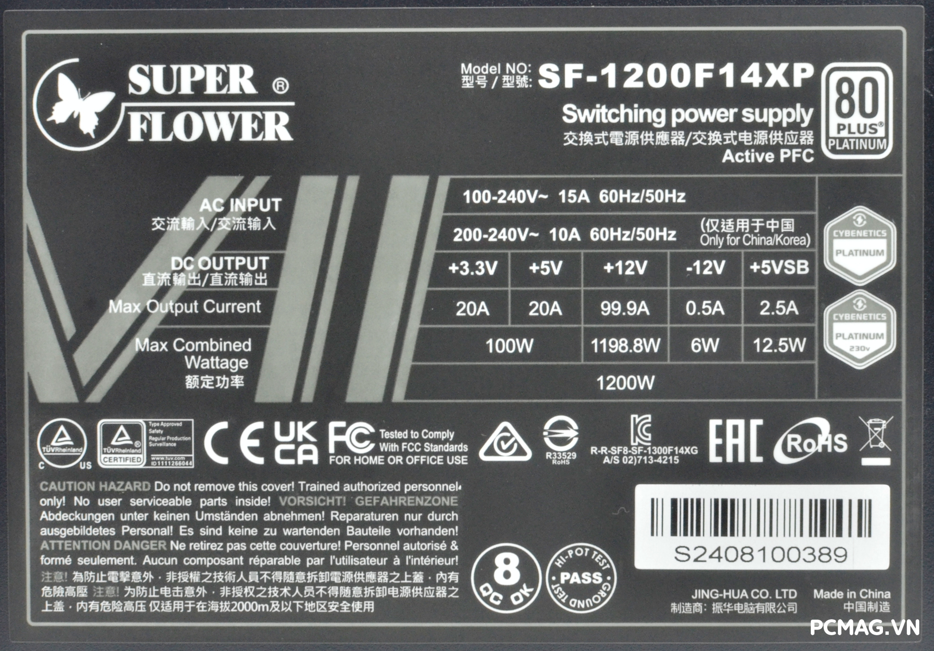 Bộ nguồn sở hữu công suất danh định 1200W, sử dụng đường 12V single rail với khả năng cấp tải lên tới 1198.8W, đảm bảo cung cấp điện năng ổn định cho các hệ thống hiệu năng cao. Sản phẩm hỗ trợ Active PFC full-range, tương thích dải điện áp rộng 100–240V AC, phù hợp với nhiều điều kiện sử dụng khác nhau. Về hiệu suất, Leadex VII Platinum Pro đạt đồng thời hai chứng nhận cao cấp 80Plus Platinum và Cybenetics Platinum, khẳng định khả năng tối ưu điện năng và giảm thiểu hao phí trong quá trình vận hành.
