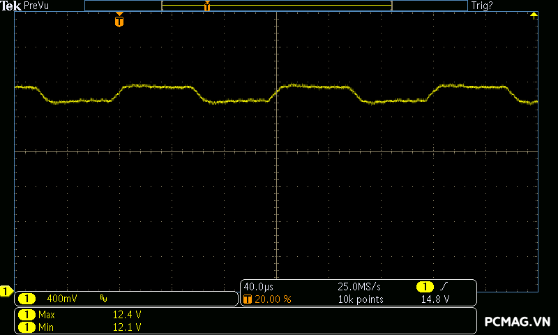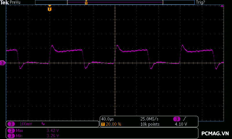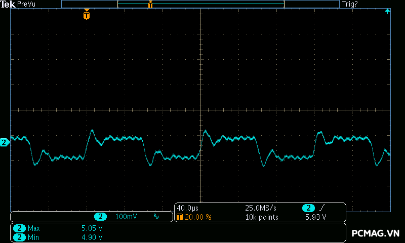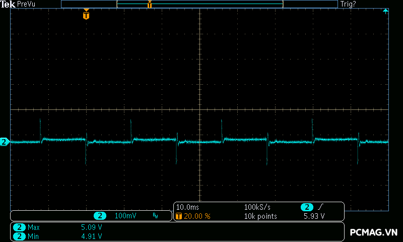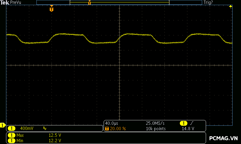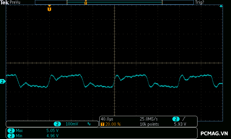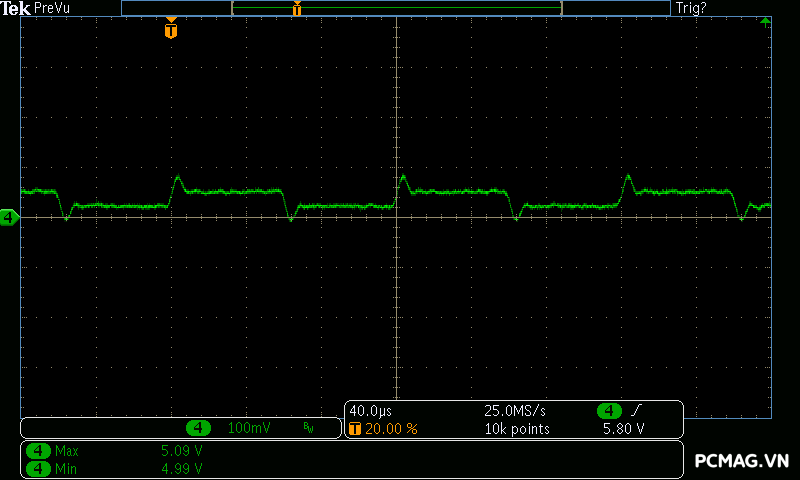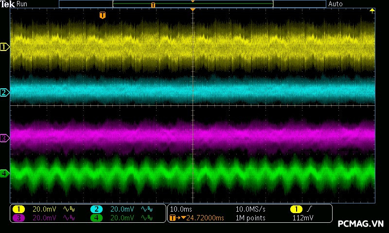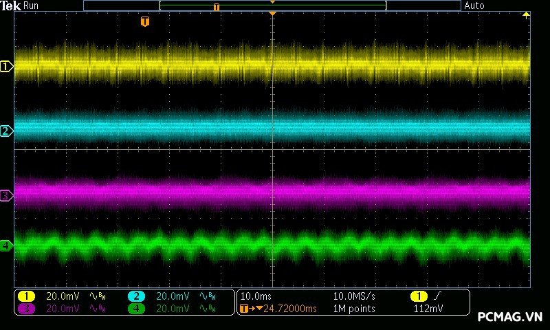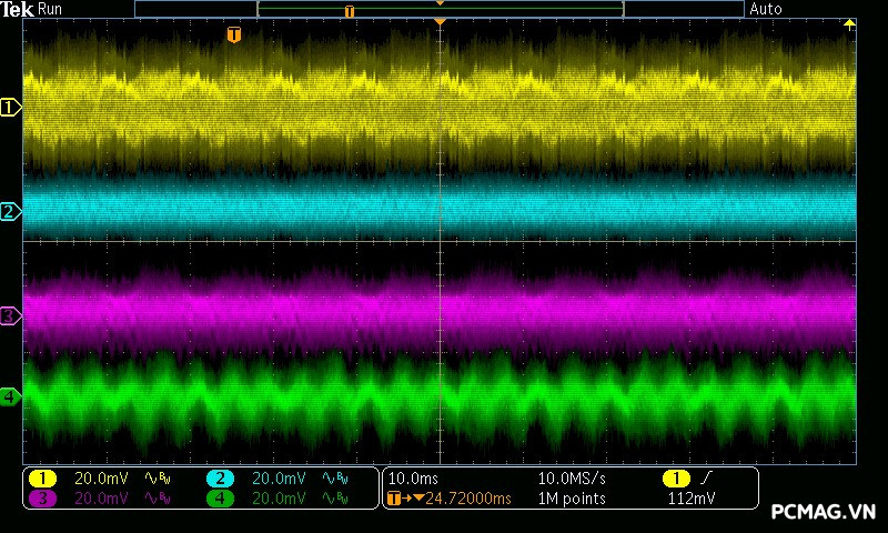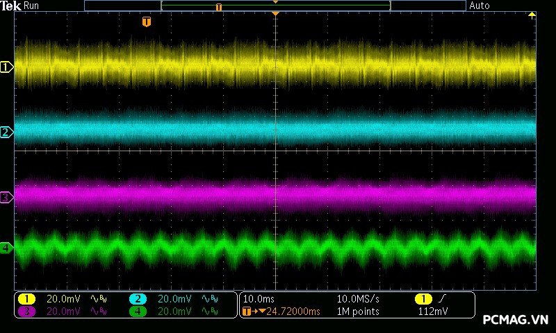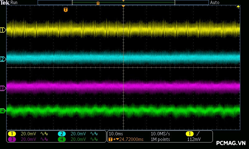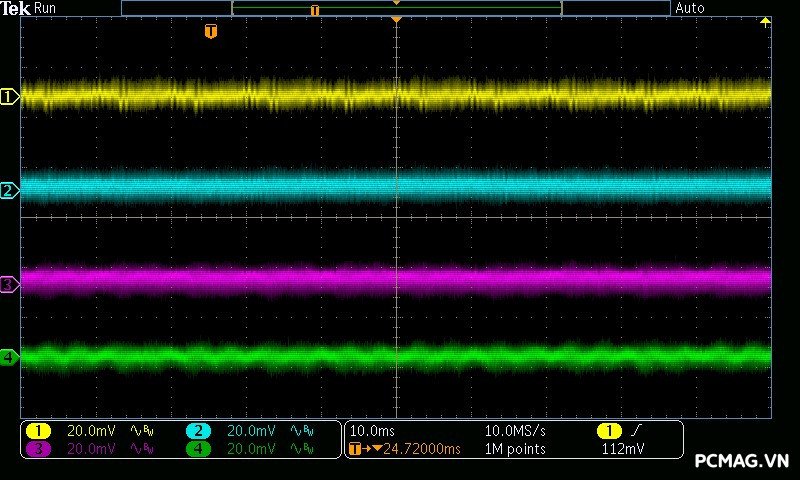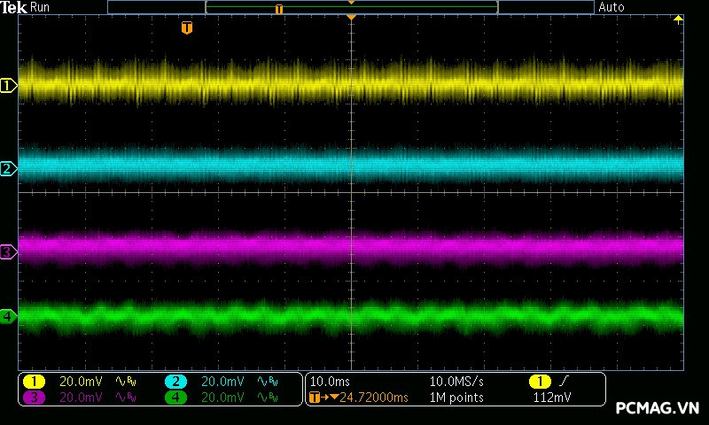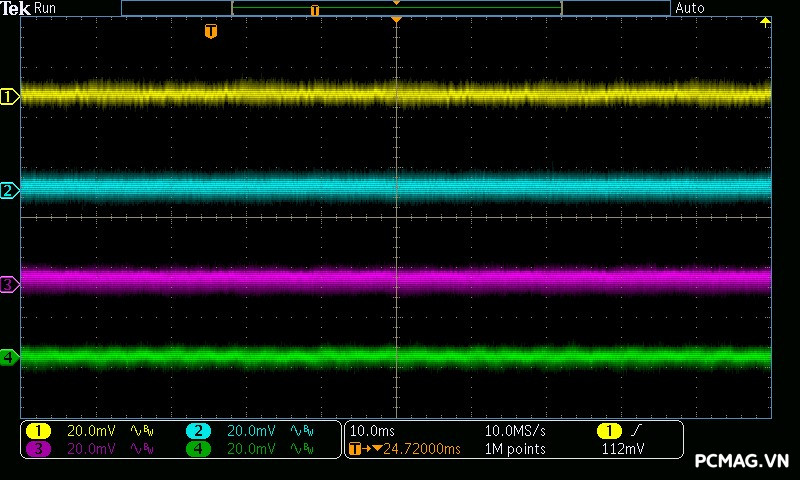Kết quả đo Ripple & Noise trên VSP MegaMax VS650D cho thấy mức kiểm soát khá tốt trong phân khúc, với giá trị tối đa khoảng 40mV trên cả 3 đường điện chính. Mức nhiễu này nằm trong giới hạn an toàn theo tiêu chuẩn ATX, góp phần đảm bảo độ ổn định và an toàn cho các linh kiện phần cứng khi vận hành lâu dài.