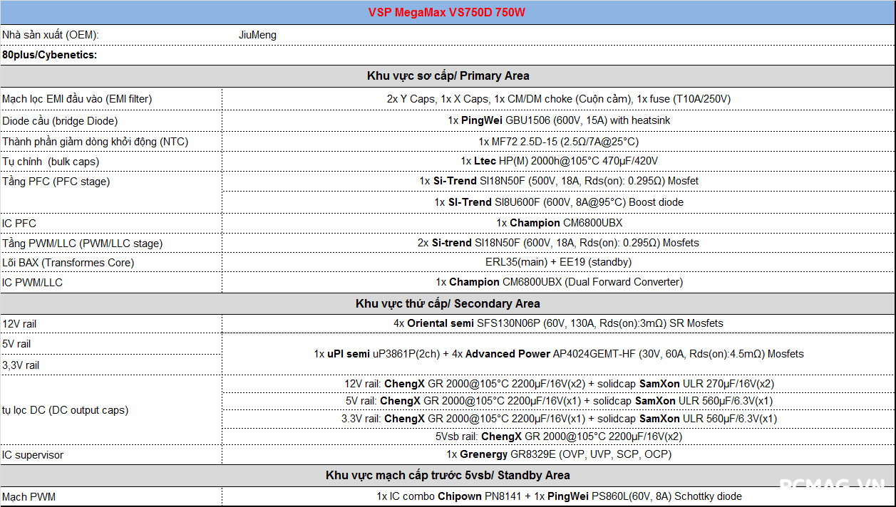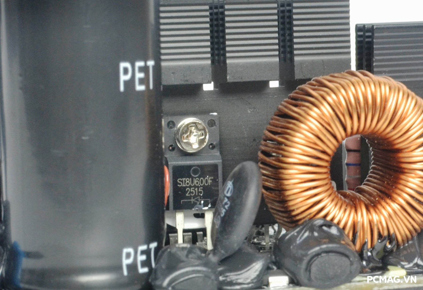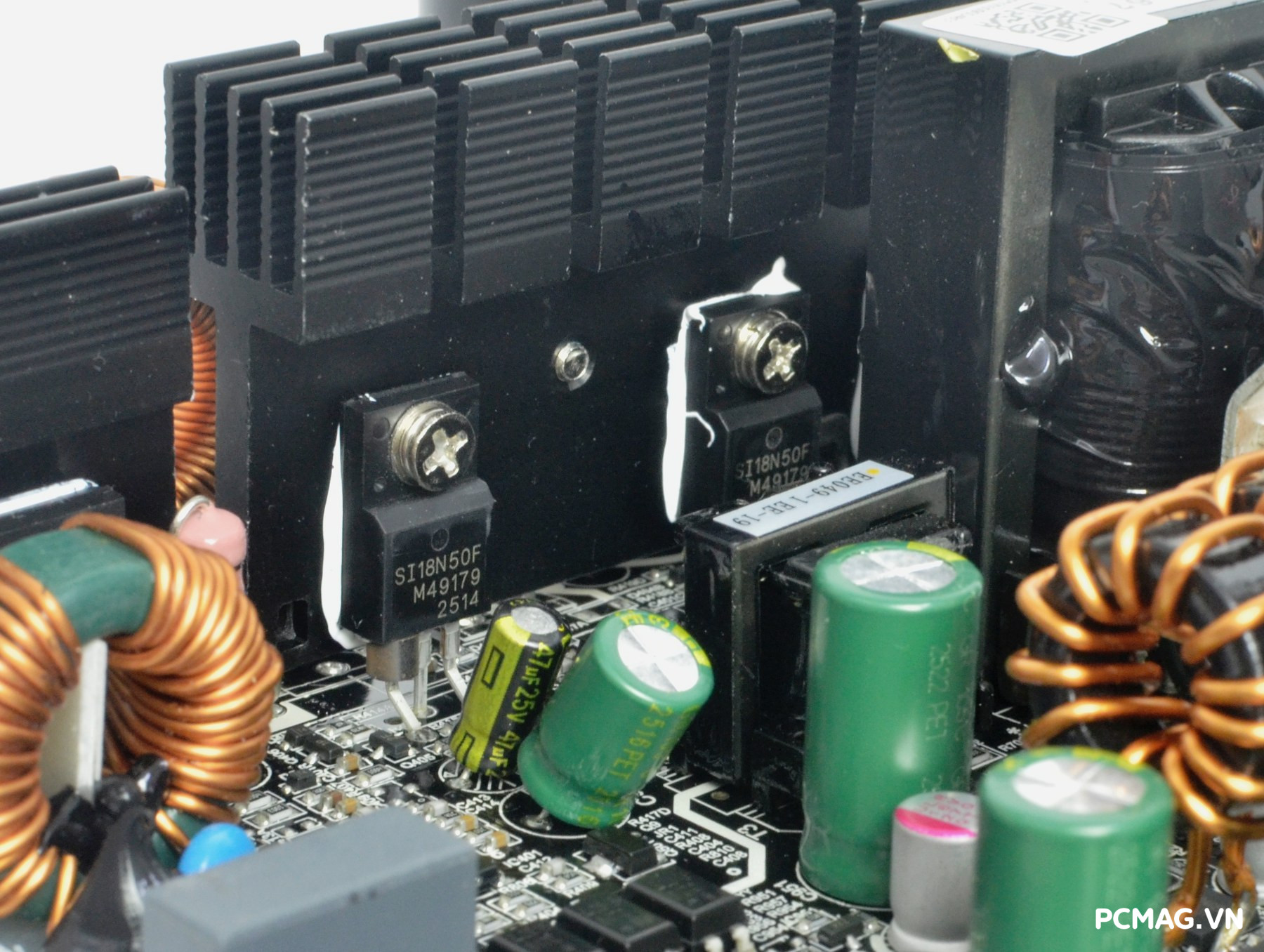Ở tầng PFC, MegaMax VS750D sử dụng 1 MOSFET SI-trend SI18N50F (18A) kết hợp với boost diode SI8U600F (8A), đảm bảo khả năng hiệu chỉnh hệ số công suất ổn định. Trong khi đó, tầng PWM được trang bị cặp MOSFET SI-trend SI186N50F (186A), đáp ứng tốt yêu cầu vận hành ở mức tải cao.