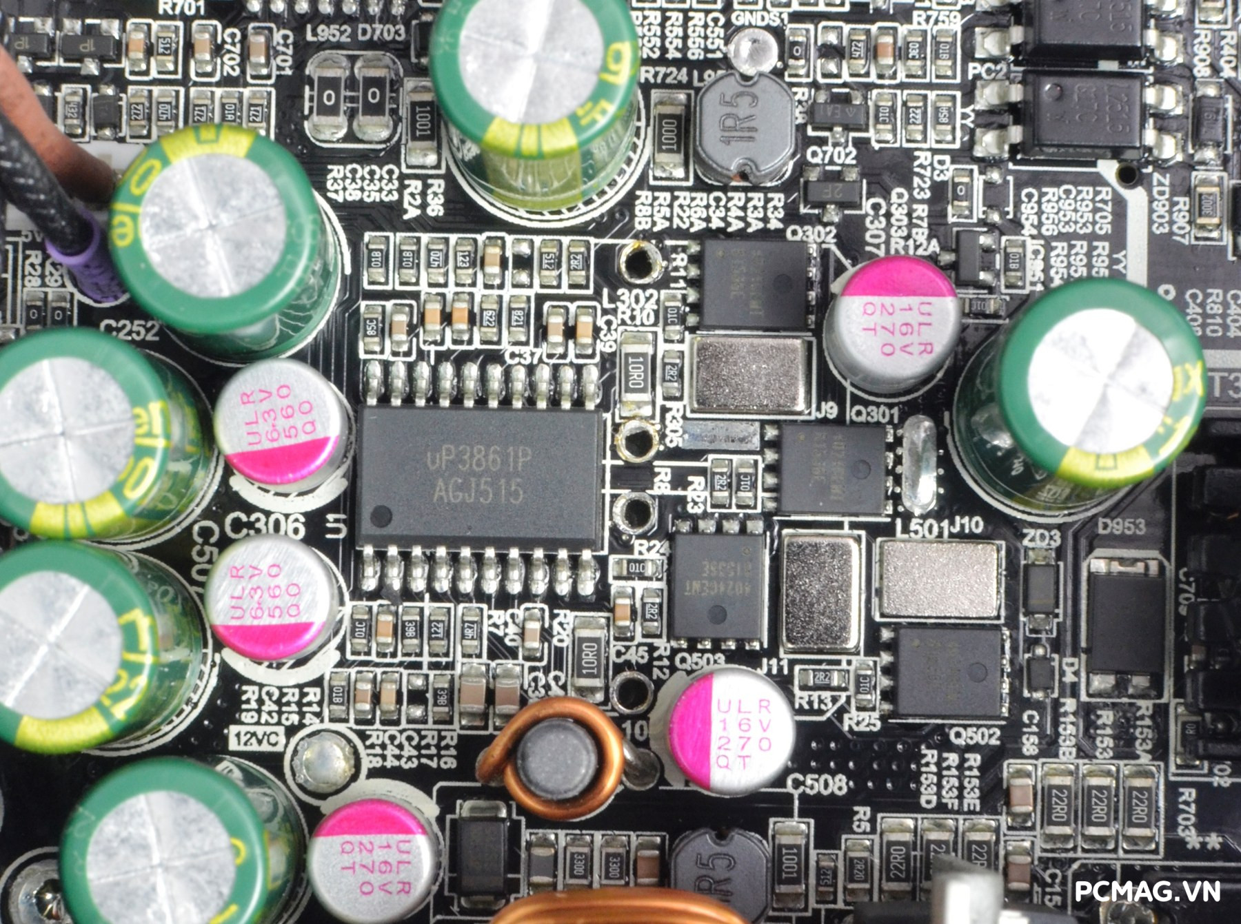 Điểm nâng cấp đáng chú ý nằm ở mạch DC-DC, khi được thiết kế lại hoàn toàn và chuyển sang sử dụng IC điều khiển uPI UP3861P, cho hiệu năng và độ ổn định vượt trội so với dòng AT8852 trước đây. Điều này giúp MegaMax VS750D cải thiện rõ rệt khả năng cấp điện và vận hành bền bỉ hơn trong các cấu hình tải cao.