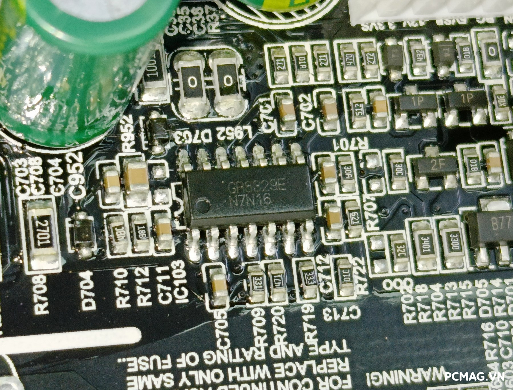 IC giám sát của MegaMax VS750D là GR8329E, hỗ trợ 4 cơ chế bảo vệ quan trọng trên cả 3 đường điện chính, bao gồm OVP, UVP, SCP và OCP, giúp hệ thống vận hành an toàn hơn trước các sự cố điện áp. Ngay khu vực gần các bó cáp cấp nguồn, có thể dễ dàng nhận thấy 3 điện trở shunt (Rshunt), đóng vai trò then chốt trong mạch bảo vệ quá dòng (OCP) cho đường +12V.