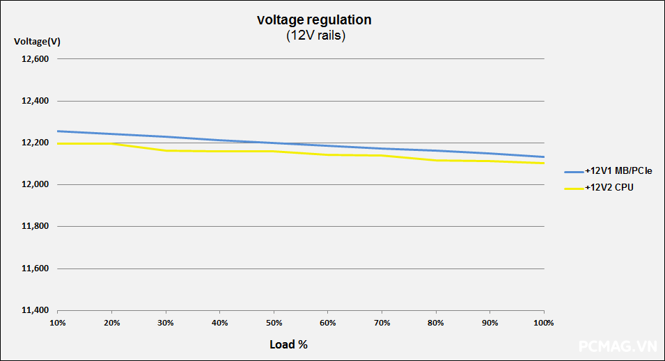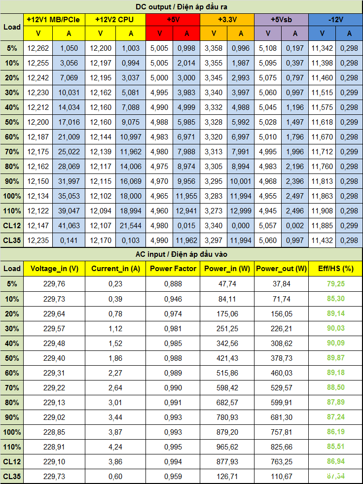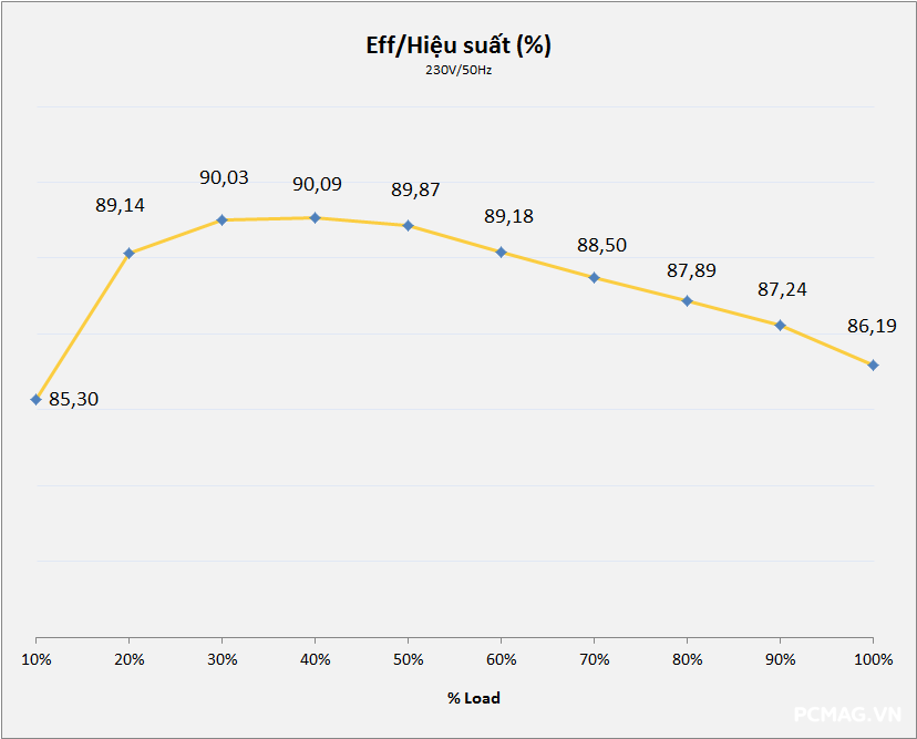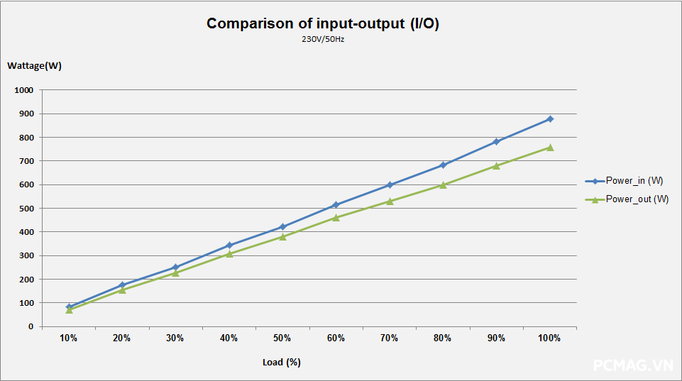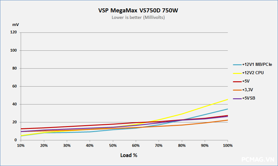 Trong quá trình thử nghiệm, MegaMax VS750D hoàn thành tốt tất cả các mức tải, với độ dao động điện áp rất nhỏ và luôn nằm trong giới hạn tiêu chuẩn ATX. Hiệu suất đo được xấp xỉ 90% tại 230Vac, đúng như những gì VSP đã cam kết. Nhờ được trang bị mạch DC to DC, các đường điện 5V và 3.3V vẫn duy trì độ ổn định cao, đáp ứng tốt yêu cầu ngay cả trong các bài test tải không đồng đều (Cross Load – CL).