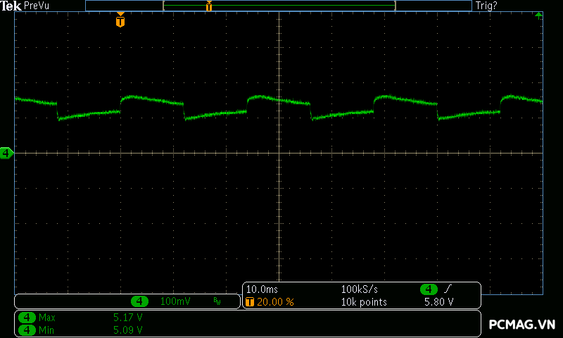 Kết quả cho thấy MegaMax VS750D kiểm soát điện áp rất tốt trong điều kiện tải biến thiên, với mức dao động trên tất cả các đường điện đều nằm trong giới hạn cho phép của tiêu chuẩn ATX, đảm bảo độ ổn định khi hệ thống thay đổi tải đột ngột.