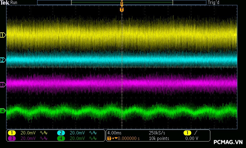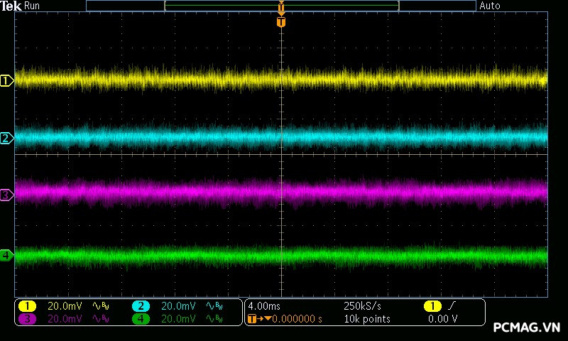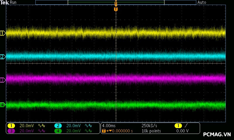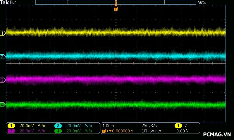 Mức Ripple & Noise của MegaMax VS750D được đánh giá khá tốt trong phân khúc, với biên độ nhiễu tối đa khoảng 45mV trên cả 3 đường điện chính, đảm bảo nằm trong giới hạn tiêu chuẩn ATX và đủ an toàn cho các linh kiện phần cứng khi vận hành lâu dài.