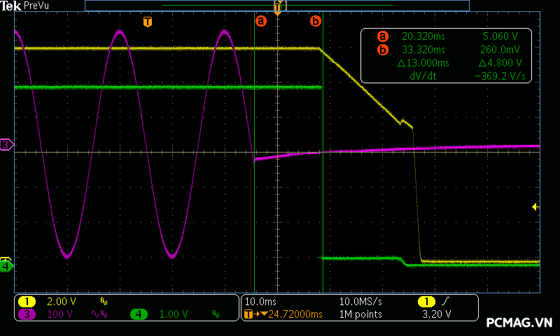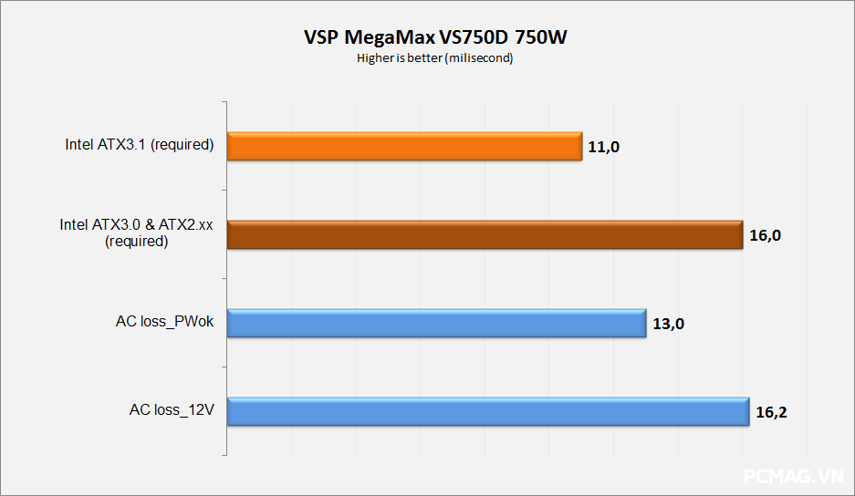 MegaMax VS750D có thời gian lưu điện ở mức khá thấp so với các tiêu chuẩn ATX 3.0 và những phiên bản trước đó. Điểm này hoàn toàn có thể được cải thiện nếu nhà sản xuất nâng cấp điện dung của tụ lọc chính, từ đó giúp bộ nguồn duy trì điện áp ổn định lâu hơn khi xảy ra hiện tượng sụt áp đầu vào.