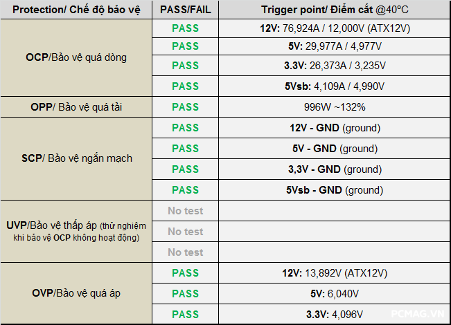 Các cơ chế bảo vệ trên MegaMax VS750D hoạt động ổn định và phản hồi nhanh, đảm bảo ngắt nguồn kịp thời khi xảy ra sự cố. Sau mỗi bài thử nghiệm, PSU đều khởi động lại an toàn, không ghi nhận bất kỳ lỗi hay hiện tượng bất thường nào, cho thấy độ tin cậy cao trong quá trình vận hành.