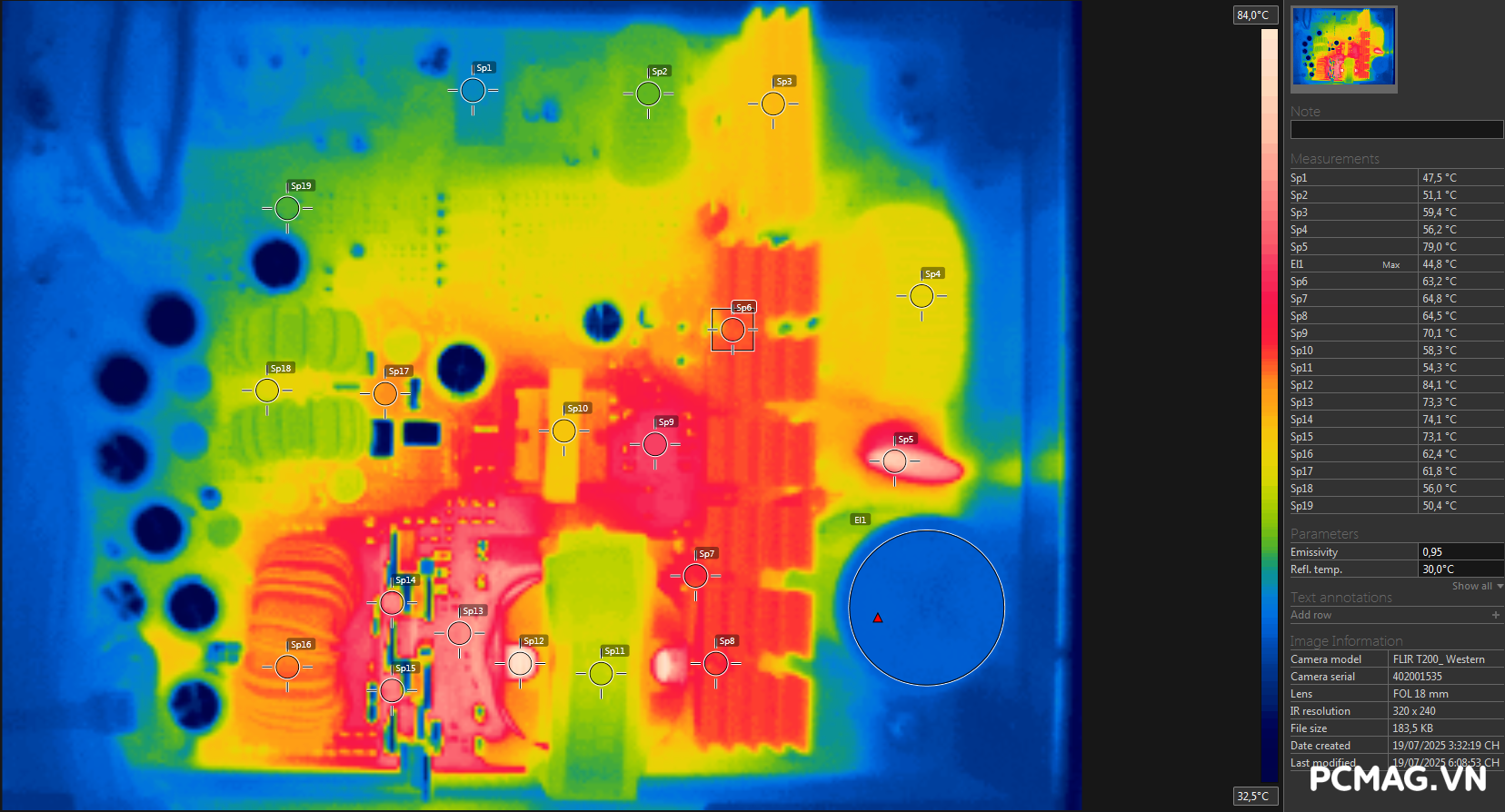 Trong điều kiện nhiệt độ môi trường khá cao, khu vực sinh nhiệt nhiều nhất trên MegaMax VS750D nằm tại ngõ ra của biến áp chính và đầu vào của các MOSFET chỉnh lưu đồng bộ, với mức nhiệt ghi nhận vào khoảng xấp xỉ 84°C.