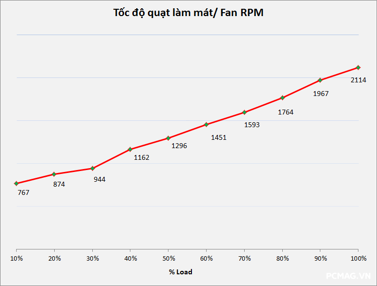 Hoạt động của quạt làm mát diễn ra theo cơ chế tăng tốc dần theo tải, khi lượng nhiệt phát sinh nhiều hơn. Ở mức cao nhất, quạt có thể đạt hơn 2100 RPM, đủ khả năng đảm bảo làm mát hiệu quả cho các linh kiện công suất bên trong. Đổi lại, khi quạt hoạt động ở tốc độ cao, độ êm ái sẽ giảm, đây là sự đánh đổi dễ hiểu để duy trì độ an toàn và ổn định cho bộ nguồn.