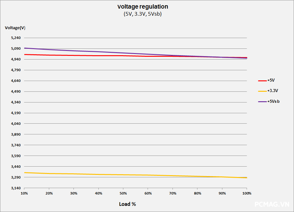 Trong quá trình thử nghiệm, MegaMax VS750D hoàn thành tốt tất cả các mức tải, với độ dao động điện áp rất nhỏ và luôn nằm trong giới hạn tiêu chuẩn ATX. Hiệu suất đo được xấp xỉ 90% tại 230Vac, đúng như những gì VSP đã cam kết. Nhờ được trang bị mạch DC to DC, các đường điện 5V và 3.3V vẫn duy trì độ ổn định cao, đáp ứng tốt yêu cầu ngay cả trong các bài test tải không đồng đều (Cross Load – CL).