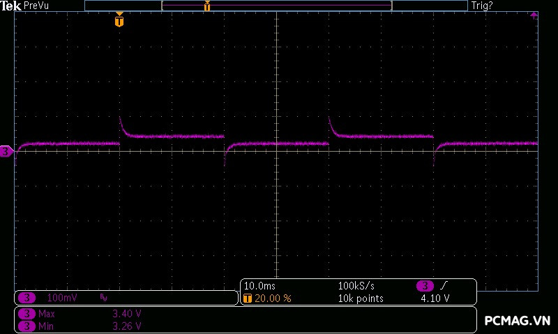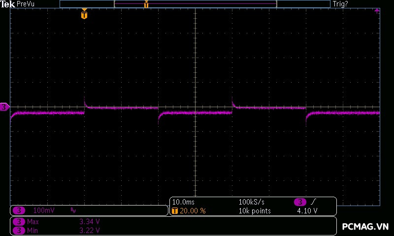 Trong bài kiểm tra mô phỏng tải biến thiên tức thời của GPU (Power Excursion), bộ nguồn tiếp tục vượt qua dễ dàng, duy trì điện áp ổn định và không xảy ra hiện tượng sập nguồn – một điểm quan trọng đối với các hệ thống sử dụng GPU đời mới có mức độ dao động dòng cực lớn.