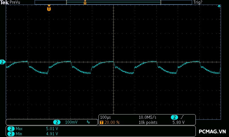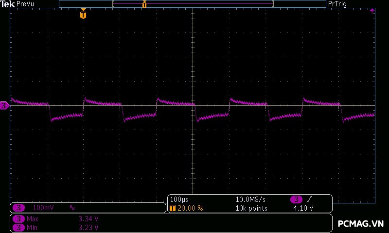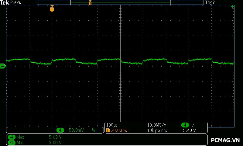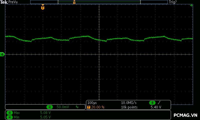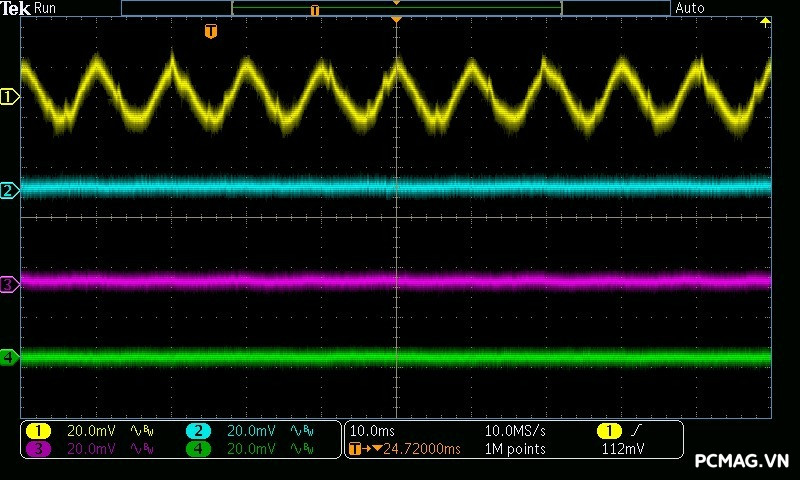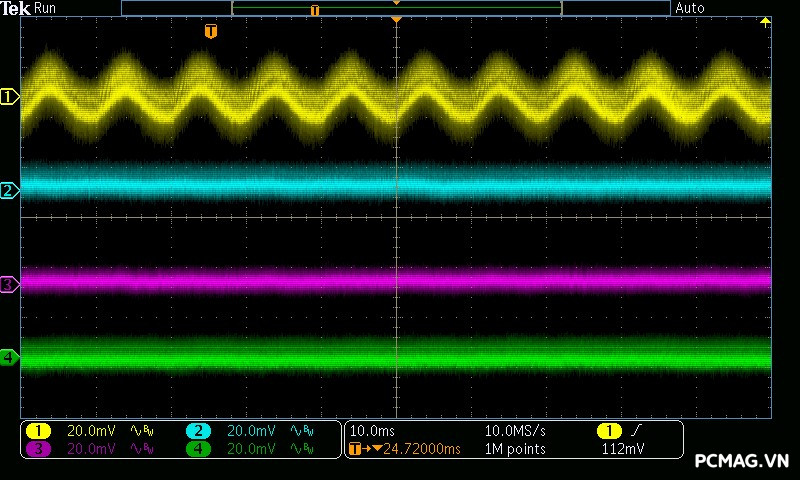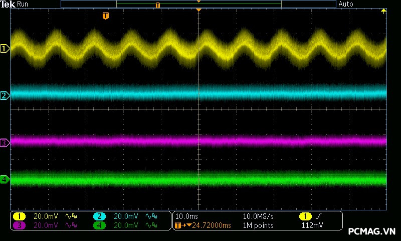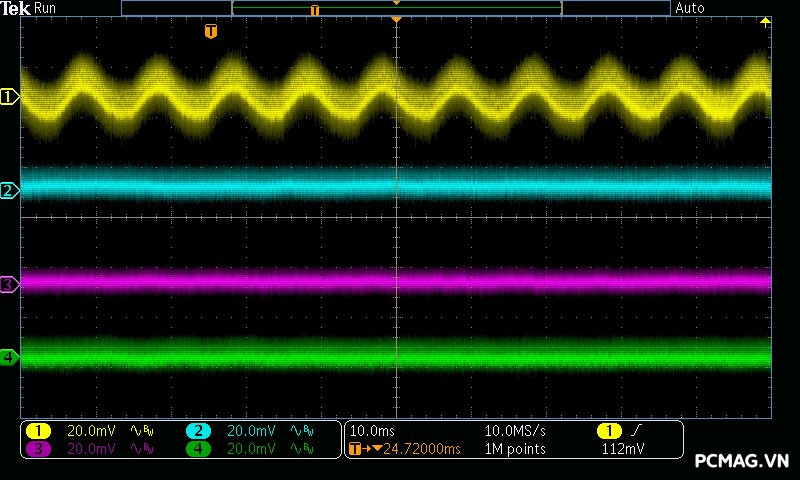 VGF750 ATX3.1/PCIe5.1 cho kết quả nhiễu cao tần rất tốt: đường 12V có mức ripple dao động quanh ~40mV, trong khi các đường điện còn lại chỉ vào khoảng ~15mV, hoàn toàn đáp ứng yêu cầu của chuẩn ATX và đảm bảo tính ổn định cho hệ thống.